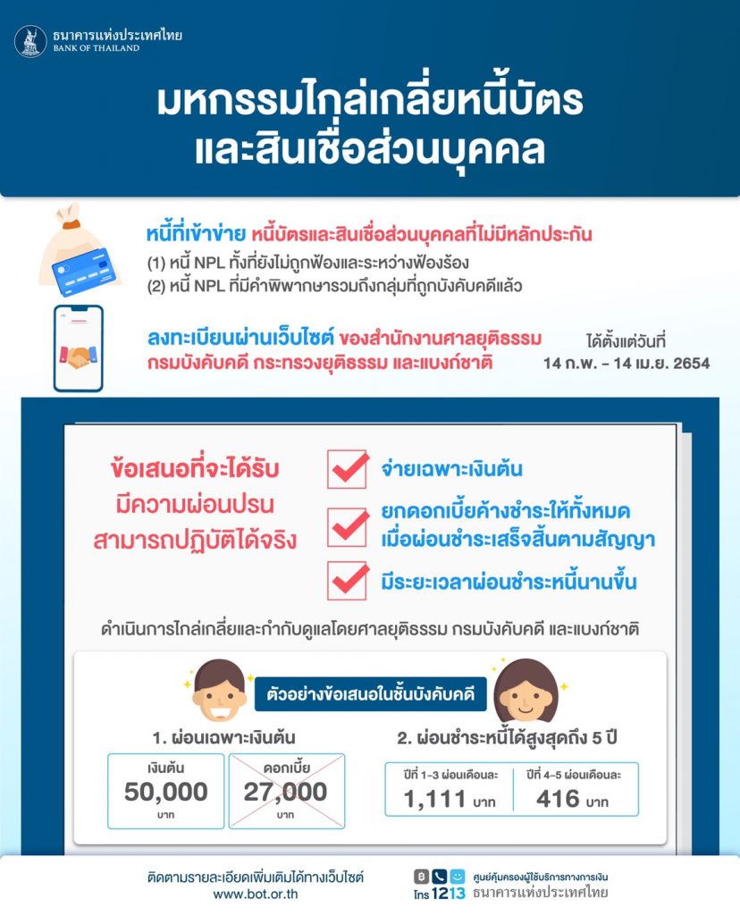 กรุงเทพฯ 10 ก.พ. – ธปท.จับมือกรมบังคับคดี จัดงานมหกรรมไกล่เกลี่ยหนี้บัตรเครดิตและสินเชื่อส่วนบุคคล โดยเฉพาะ ลูกหนี้บัตรเครดิตที่ยังไม่เป็น NPL แต่เริ่มขาดสภาพคล่อง สามารถเข้าร่วมมหกรรมการไกล่เกลี่ยหนี้ได้ ในระหว่างวันที่ 14 ก.พ. – 14 เม.ย. 64 นี้