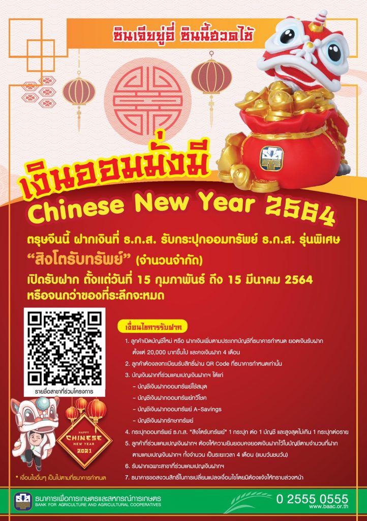 นายสุรชัย รัศมี รองผู้จัดการ รักษาการแทนผู้จัดการธนาคารเพื่อการเกษตรและสหกรณ์การเกษตร (ธ.ก.ส.) เปิดเผยว่า ธ.ก.ส. ได้จัดแคมเปญ “เงินออมมั่งมี Chinese New Year ปี 2564” เพื่อส่งความสุข ความปรารถนาดีและความเป็นสิริมงคล เนื่องในเทศกาลตรุษจีน ปี 2564 ให้แก่ผู้ฝากเงินกับ ธ.ก.ส. โดยจะได้รับกระปุกออมทรัพย์ “สิงโตรับทรัพย์” ซึ่งมีลักษณะเป็นหุ่นเชิดสิงโตเกาะถุงแดงที่บรรจุเงิน หยวนเป่าหรือเงินตำลึงจีนที่ล้นออกมาจากถุง เสมือนเป็นสัญลักษณ์แห่งความมั่งคั่งร่ำรวยและความเป็นสิริมงคล เป้าหมายรับฝาก 500 ล้านบาท โดยเปิดรับฝากตั้งแต่วันที่ 15 กุมภาพันธ์ ถึง 15 มีนาคม 2564 หรือจนกว่าของที่ระลึกจะหมด