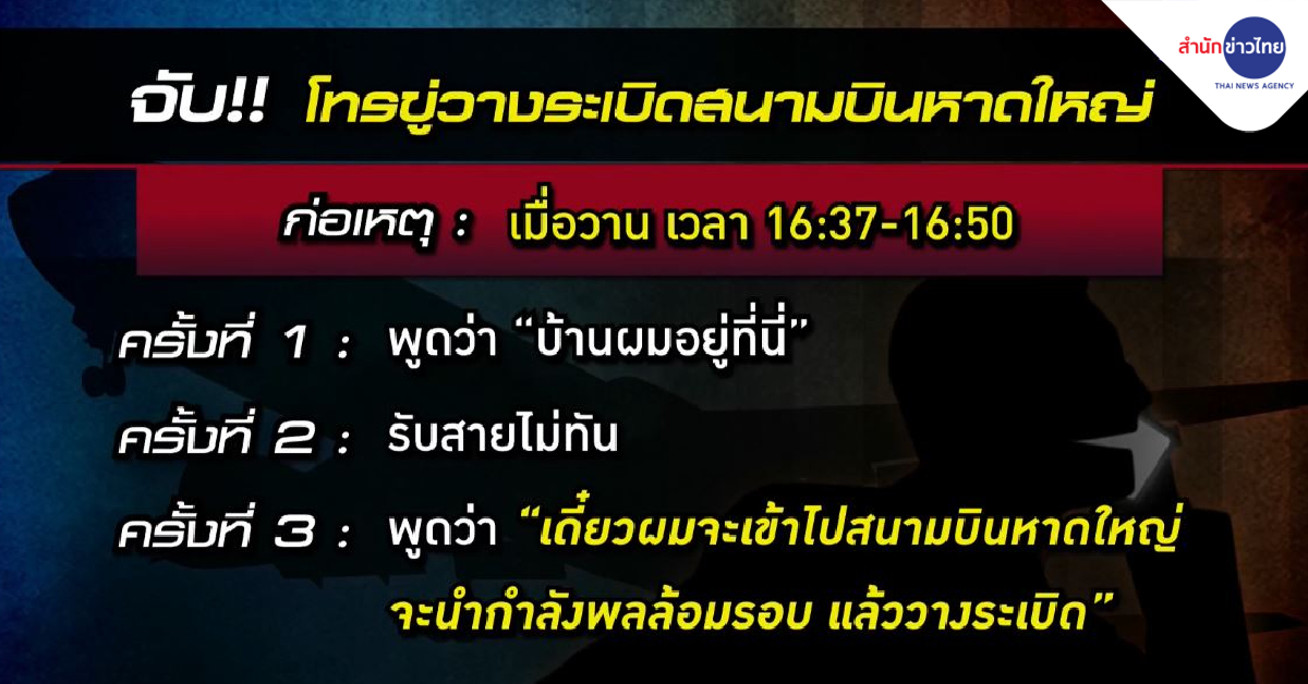 สงขลา 12 ก.พ. – จับได้แล้ว! หนุ่มหลอนยาโทรศัพท์ไปขู่วางระเบิดสนามบินหาดใหญ่ 3 ครั้ง เมื่อวานนี้ พบสติมีปัญหาจากการเสพยาอย่างหนัก