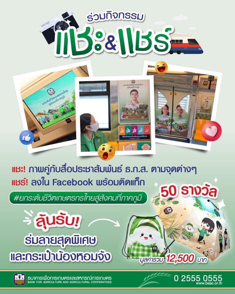 กรุงเทพฯ 16 ก.พ. – ธ.ก.ส. ชวนร่วมสนุกกับกิจกรรม “แชะ&แชร์” เพียงถ่ายรูปคุณคู่กับสื่อประชาสัมพันธ์อัตลักษณ์ ธ.ก.ส. ในชุด “ยกระดับชีวิตเกษตรกรไทยสู่สังคมที่ภาคภูมิ” ทั้งป้ายสื่อโฆษณาบนรถไฟฟ้า BTS ป้ายโฆษณาด้านหน้าสาขา ธ.ก.ส. และป้าย LED ทั่วประเทศ จากนั้นโพสต์ผ่าน Facebook ของตนเอง พร้อมติดแฮชแท็ก #ยกระดับชีวิตเกษตรกรไทยสู่สังคมที่ภาคภูมิ โดยเขียนข้อความสิ่งที่อยากบอก ธ.ก.ส. 1 ประโยค ลุ้นรับกระเป๋าน้องหอมจังหรือร่มลายสุดพิเศษ จำนวน 50 รางวัล มูลค่ารวม 12,500 บาท ตั้งแต่บัดนี้ถึง 25 ก.พ. 64 ประกาศผล 28 ก.พ. 64 ทาง Facebook Page ธกส BAAC Thailand