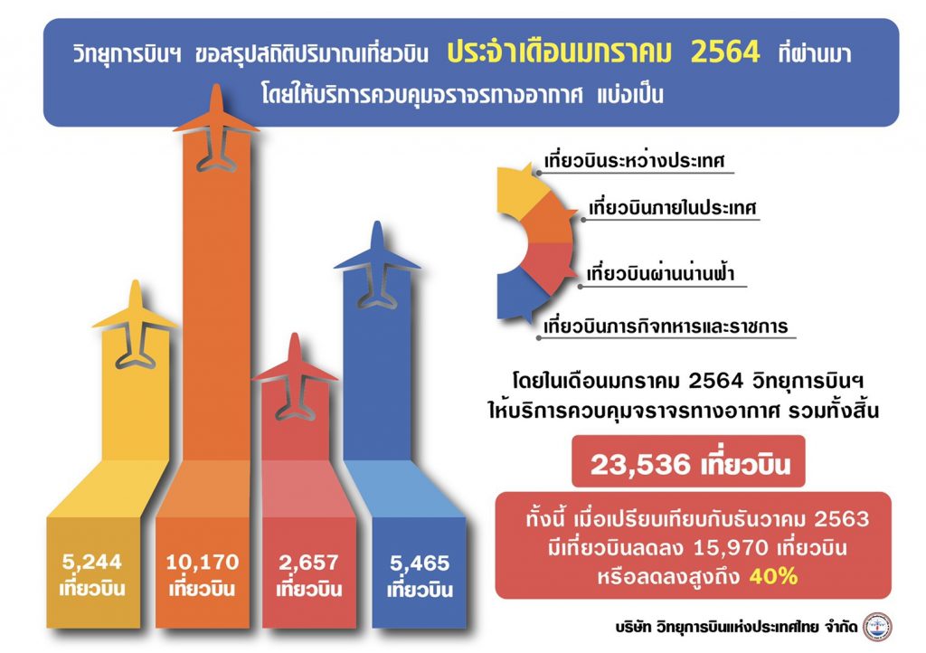 กรุงเทพฯ 17 ก.พ.-บริษัทวิทยุการบินแห่งประเทศไทยระบุโควิด-19 ระบาดใหม่ ทำเที่ยวบิน ม.ค.64 ลดลงถึงร้อยละ 40 รวมเที่ยงบินให้บริการจราจรทางอากาศ 23,536 เที่ยวบิน