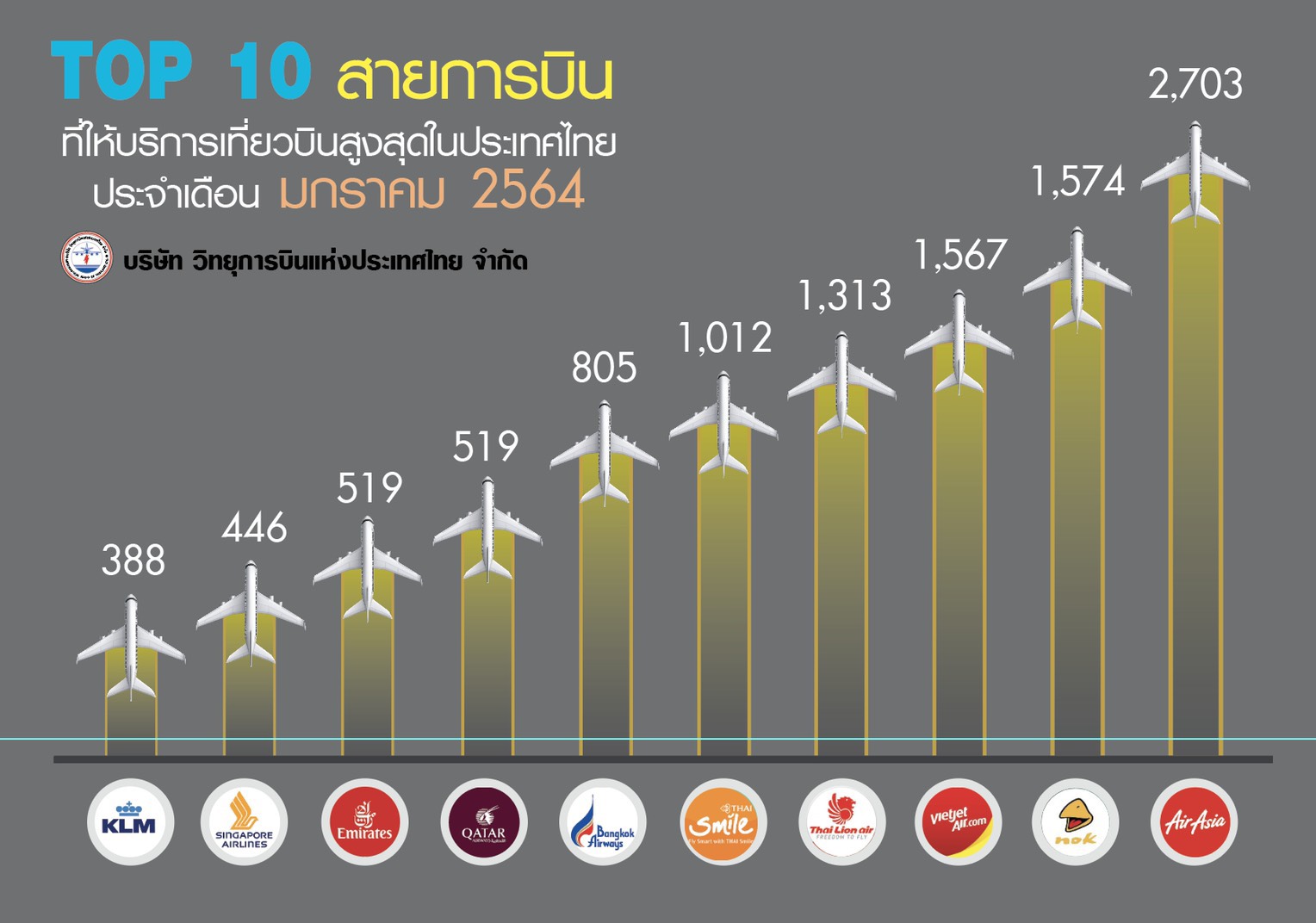 ทั้งนี้ ในเดือนมกราคม 2564 วิทยุการบินฯ ให้บริการจราจรทางอากาศ รวม 23,536 เที่ยวบิน โดยแบ่งเป็น เที่ยวบินภายในประเทศ 10,170 เที่ยวบิน เที่ยวบินระหว่างประเทศ 5,244 เที่ยวบิน เที่ยวบินผ่านน่านฟ้า 2,657 เที่ยวบิน เที่ยวบินสนับสนุนการปฏิบัติภารกิจทางทหารและราชการ 5,465 ทั้งนี้ เมื่อเปรียบเทียบกับธันวาคม 2563 ลดลง 15,970 เที่ยวบิน หรือลดลงถึงร้อยละ 40 โดยข้อมูลดังกล่าวเป็นการนับจำนวน Flight Movement ตาม Flight Plan.-สำนักข่าวไทย