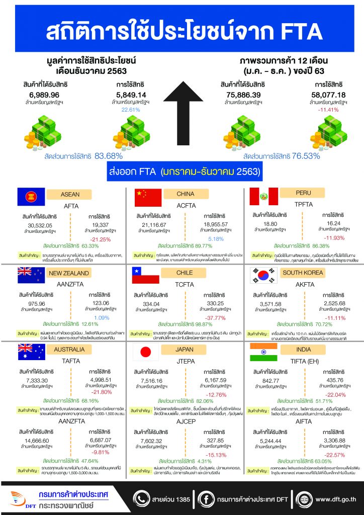 ทั้งนี้ การใช้สิทธิประโยชน์ภายใต้ความตกลงทางการค้าเสรี (FTA) ระหว่างเดือนมกราคม-ธันวาคม 2563 มีมูลค่า 58,077.18 ล้านดอลลาร์สหรัฐฯ ลดลงเมื่อเทียบกับช่วงเวลาเดียวกันของปีที่ผ่านมา ร้อยละ 11.41มีสัดส่วนการใช้สิทธิฯ ร้อยละ 76.53 โดยตลาดที่ไทยส่งออกโดยมีมูลค่าการใช้สิทธิฯ ภายใต้ FTA สูงสุด 5 อันดับแรก ได้แก่ 1.อาเซียน (มูลค่า 19,337 ล้านดอลลาร์สหรัฐฯ) 2.จีน (มูลค่า 18,955.57 ล้าดอลลาร์สหรัฐฯ) 3.ออสเตรเลีย (มูลค่า 6,987.07 ล้านดอลลาร์สหรัฐฯ) 4.ญี่ปุ่น (มูลค่า 6,495.44 ล้านดอลลาร์สหรัฐฯ)และ 5.อินเดีย (มูลค่า 3,306.88 ล้านดอลลาร์สหรัฐฯ)