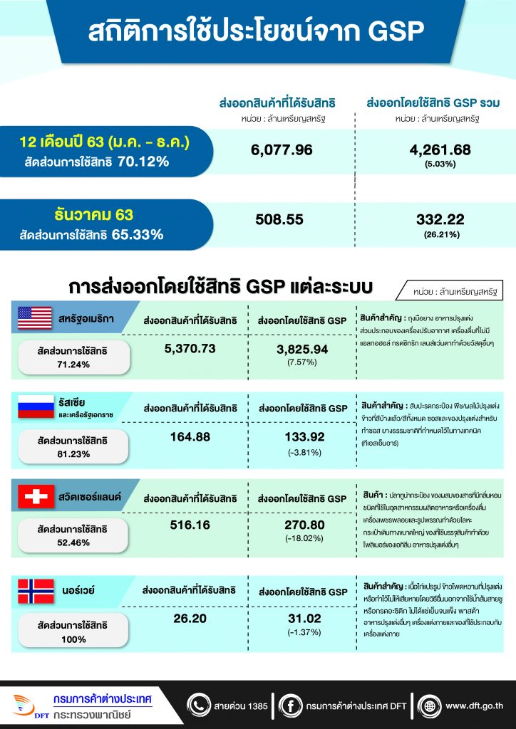 นอกจากนี้ การใช้สิทธิประโยชน์ภายใต้ระบบสิทธิพิเศษทางภาษีศุลกากรเป็นการทั่วไป หรือ GSP ทั้ง 4 ระบบ สหรัฐอเมริกา สวิตเซอร์แลนด์ รัสเซียและเครือรัฐเอกราช และนอร์เวย์ ในปี 2563 มีมูลค่าการใช้สิทธิฯ 4,261.68 ล้านดอลลาร์สหรัฐฯ ขยายตัวร้อยละ 5.03 และมีสัดส่วนการใช้สิทธิฯ ร้อยละ 70.12 ตลาดส่งออกที่ไทยมีมูลค่าการใช้สิทธิฯ มากที่สุดคือ สหรัฐอเมริกา มีมูลค่าการใช้สิทธิฯ 3,825.94 ล้านดอลลาร์สหรัฐฯ เพิ่มขึ้นจากช่วงเวลาเดียวกันของปีก่อนร้อยละ 7.57 และมีสัดส่วนการใช้สิทธิฯ ร้อยละ 71.24 อันดับสองคือ สวิตเซอร์แลนด์ มีมูลค่าการใช้สิทธิฯ 270.80 ล้านดอลลาร์สหรัฐฯ ลดลงจากช่วงเวลาเดียวกันของปีก่อนร้อยละ 18.02 และมีสัดส่วนการใช้สิทธิฯ ร้อยละ 52.46 อันดับ 3 คือ รัสเซียและเครือรัฐเอกราช มีมูลค่าการใช้สิทธิฯ 133.92 ล้านดอลลาร์สหรัฐฯ ลดลงจากช่วงเวลาเดียวกันของปีก่อนร้อยละ 3.81 และมีสัดส่วนการใช้สิทธิฯ ร้อยละ 81.23 และนอร์เวย์ มีมูลค่าการใช้สิทธิฯ 31.02 ล้านดอลลาร์สหรัฐฯ ลดลงจากช่วงเวลาเดียวกันของปีก่อนร้อยละ 1.37 และมีสัดส่วนการใช้สิทธิฯ ร้อยละ 100