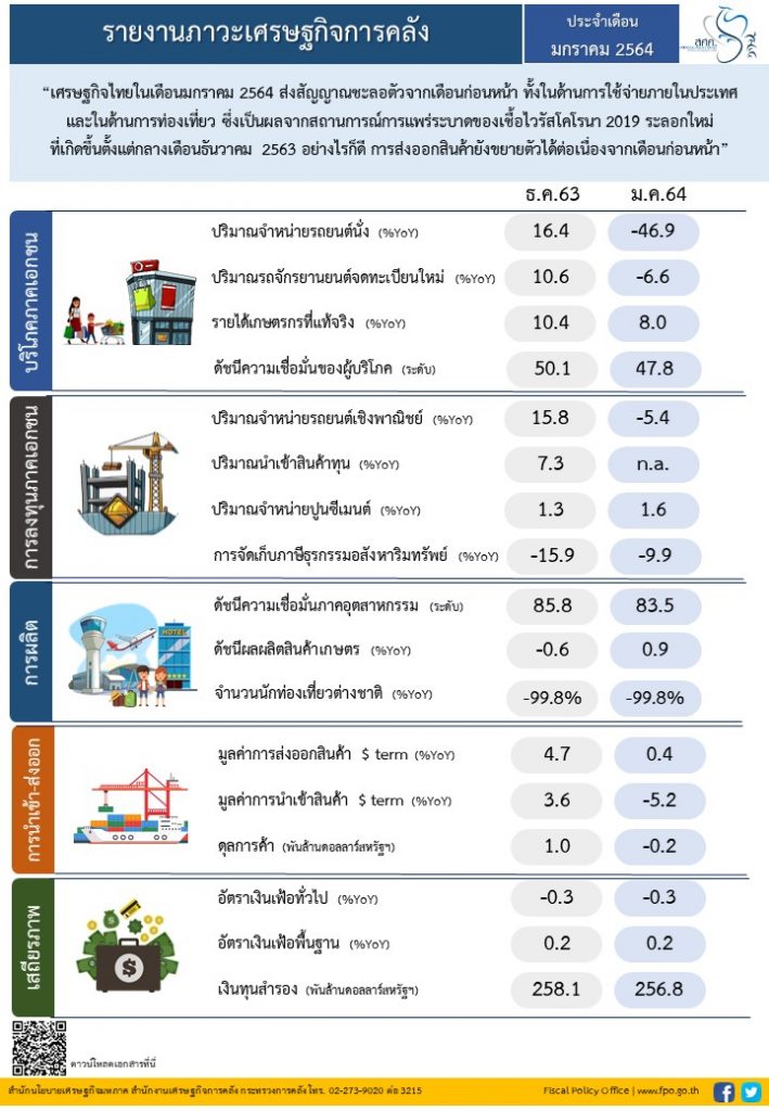กรุงเทพฯ 24 ก.พ. – สำนักงานเศรษฐกิจการคลัง (สศค.) เผยเศรษฐกิจไทยในเดือนมกราคม 2564 ส่งสัญญาณชะลอตัวจากเดือนก่อนหน้า ทั้งในด้านการใช้จ่ายภายในประเทศ และในด้านการท่องเที่ยว ซึ่งเป็นผลจากสถานการณ์การแพร่ระบาดของเชื้อไวรัสโคโรนา 2019 ระลอกใหม่ที่เกิดขึ้นตั้งแต่กลางเดือนธันวาคม 2563 อย่างไรก็ดี การส่งออกสินค้ายังขยายตัวได้ต่อเนื่องจากเดือนก่อนหน้า