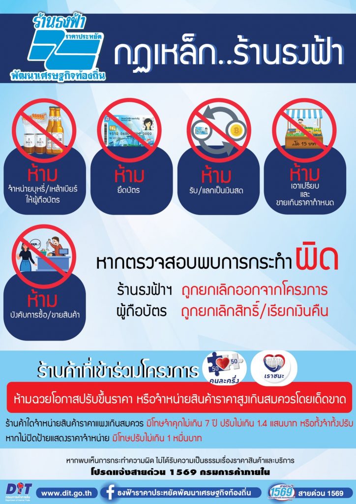 นอกจากนี้ ยังให้สำนักงานพาณิชย์จังหวัดเร่งประชาสัมพันธ์การดำเนินการ โดยเน้นการป้องปรามการกระทำความผิดของร้านค้า หากพบหลักฐานว่าร้านค้าใดจำหน่ายสินค้าราคาแพงเกินสมควร จะถูกดำเนินคดีตามมาตรา 29 โดยมีโทษปรับไม่เกิน 140,000 บาท จำคุกไม่เกิน 7 ปี หรือทั้งจำทั้งปรับ หากประชาชนพบการกระทำความผิดให้แจ้งสายด่วนกรมการค้าภายใน 1569 หรือสำนักงานพาณิชย์จังหวัดทั่วประเทศ