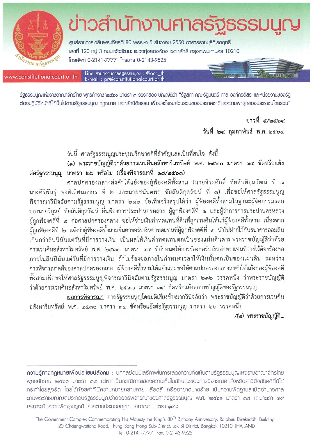 กรุงเทพฯ 24 ก.พ. – ศาลรัฐธรรมนูญวินิจฉัย ม.34 พ.ร.บ.เวนคืนอสังหาริมทรัพย์ ไม่ยื่นขอเงินค่าทดแทนที่ดินที่ถูกเวนคืนภายใน 10 ปี ขัดรัฐธรรมนูญ