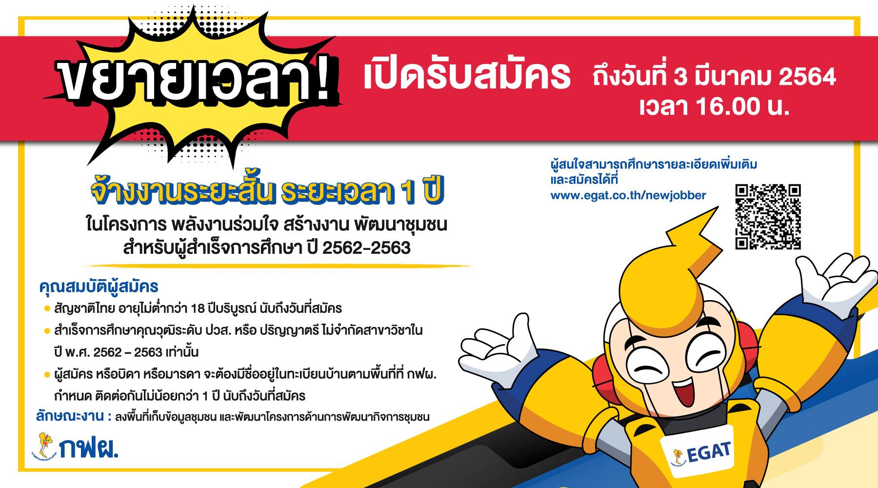 กรุงเทพฯ 25 ก.พ.- กฟผ.ขยายเวลารับสมัครนักศึกษาจบใหม่เข้าร่วม “โครงการพลังงานร่วมใจ สร้างงาน พัฒนาชุมชน” ครั้งที่ 2 เพิ่มเติมอีก 7 วัน โดยจะเปิดรับสมัครต่อเนื่องตั้งแต่วันนี้-3 มี.ค.64