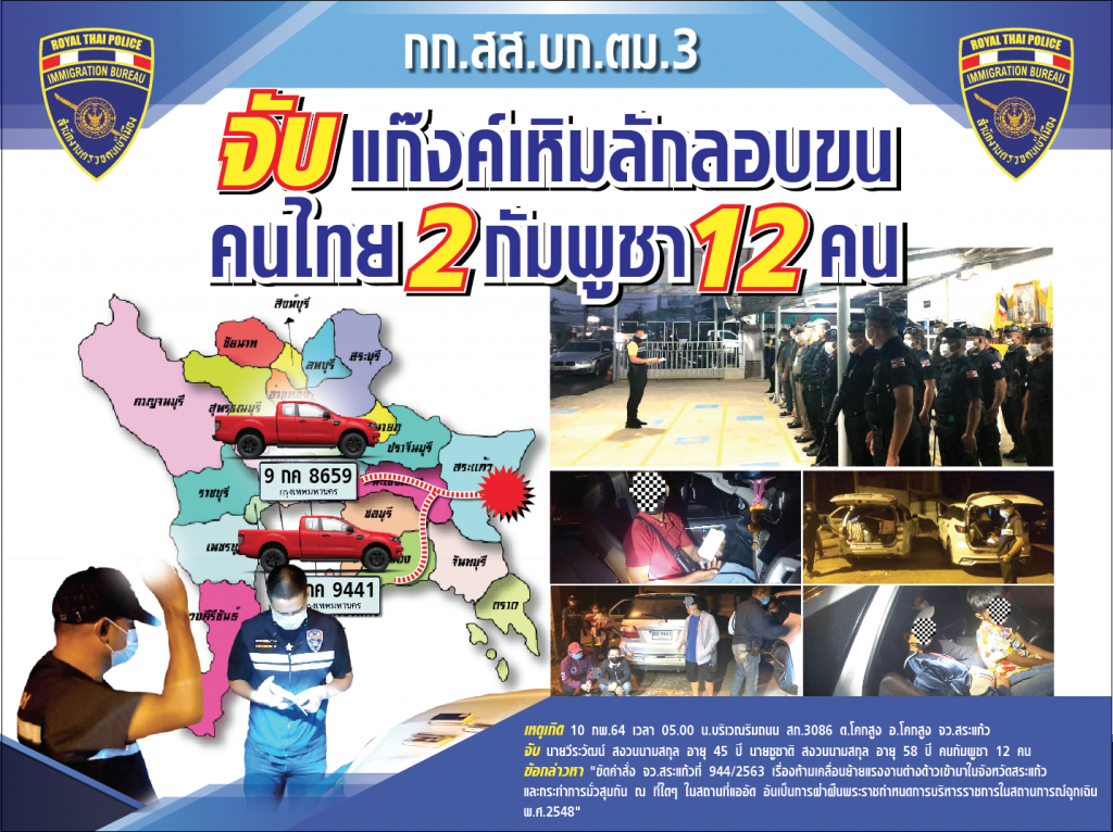 นอกจากนี้ จับกุมแก๊งเหิมลักลอบขนชาวกัมพูชาเข้า-ออกพื้นที่จังหวัดสระแก้วเข้าสู่พื้นที่ชั้นในทั้งจังหวัดชลบุรี และกรุงเทพฯ จึงได้ทำการสืบสวนจนกระทั่งทราบว่ากลุ่มคนร้ายจะนำรถยนต์กระบะมีหลังคา ทะเบียน 9กง xxxx กทม. มีพฤติกรรมวิ่งรับส่งขนคนต่างด้าว จึงได้วางแผนจับกุมจนกระทั่ง พบรถยนต์คันดังกล่าวพร้อมด้วย รถยนต์ทะเบียน ฌป xxxx กทม. ลักษณะพิรุธจึงได้ติดตามสกัดจับได้ที่บริเวณริมถนน สก.3086 ต.โคกสูง อ.โคกสูง จว.สระแก้ว ผลการตรวจสอบพบ นายวีระวัฒน์ สงวนนามสกุล อายุ 45 ปี และ นายชูชาติ สงวนนามสกุล อายุ 58 ปี แสดงตนเป็นคนขับรถยนต์ทั้งสองคันดังกล่าว ภายในรถตรวจพบ คนต่างด้าวสัญชาติกัมพูชา 12 คน สอบถามรับว่ารับคนต่างด้าวดังกล่าว โดย นายวีระวัฒน์ฯ รับมาจากบริเวณช้างสามเศียร สมุทรปราการ จำนวน 7 คน ส่วน นายชูชาติฯ รับจากพื้นที่ชลบุรี จำนวน 5 คน เพื่อไปส่งให้นายหน้ากัมพูชาที่บริเวณชายแดนเพื่อส่งออก และขณะเดียวกันก็จะรับคนต่างด้าวเข้ามาในพื้นที่ชั้นอีกทีต่อหนึ่ง จึงได้แจ้งข้อกล่าวหาว่า “ขัดคำสั่ง จว.สระแก้วที่ 944/2563 เรื่องห้ามเคลื่อนย้ายแรงงานต่างด้าวเข้ามาในจังหวัดสระแก้ว และกระทำการมั่วสุมกัน ณ ที่ใดๆ ในสถานที่แออัด อันเป็นการฝ่าฝืนพระราชกำหนดการบริหารราชการในสถานการณ์ฉุกเฉิน พ.ศ.2548”.-สำนักข่าวไทย
