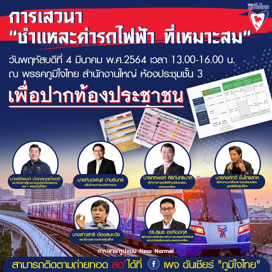 นายภราดร ปริศนานันทกุล โฆษกพรรคภูมิใจไทย เปิดเผยว่า พรรคภูมิใจไทยจะมีการจัดเสวนา เรื่อง “ชำแหละค่ารถไฟฟ้า ที่เหมาะสม” วันที่ 4 มีนาคม 2564 ที่ห้องประชุมพรรคภูมิใจไทย เพื่อเป็นการแก้ไขปัญหาค่าครองชีพให้กับพี่น้องประชาชนชาวกรุงเทพมหานคร และปริมณฑล รวมถึงชาวต่างจังหวัด ที่ต้องมาทำงานในพื้นที่เมืองหลวง สามารถเข้าถึงบริการรถไฟฟ้าในราคาที่ไม่สูงจนเกินไป มีค่าใช้จ่ายที่เหมาะสมในชีวิตประจำวัน