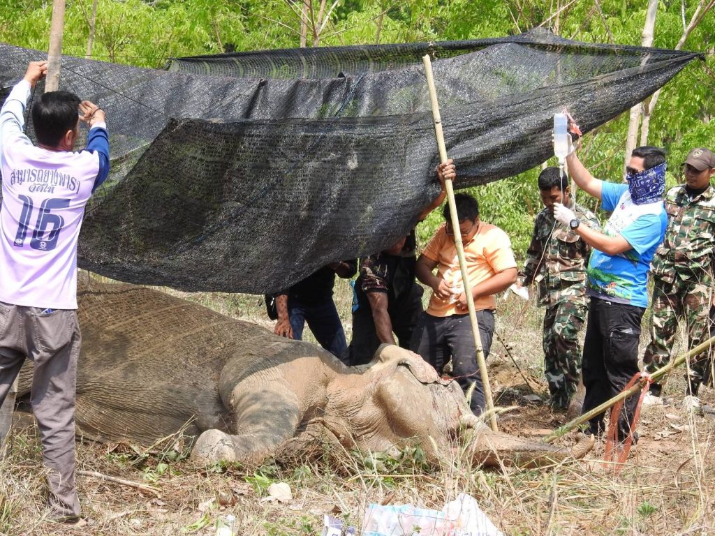 ทั้งนี้ทีมสัตวแพทย์ สบอ.2 (ศรีราชา) ประสานหัวหน้าเขตรักษาพันธุ์สัตว์ป่าเขาอ่างฤๅไน ให้จัดเตรียมรถแมคโครขนาดใหญ่เพื่อตักดินและดันตัวแม่ช้างป่าตัวให้ลุกขึ้นยืน ทำการรักษาแบบพยุงอาการ โดยให้สารน้ำเข้าหลอดเลือดดำและให้สารละลายกลูโคส พร้อมทั้งวิตามินบำรุง เจาะเก็บเลือดส่งตรวจหาสาเหตุอาการป่วย หากพบว่า ติดเชื้อชนิดใดจะได้ให้ยารักษาให้ถูกต้องโดยเร็ว