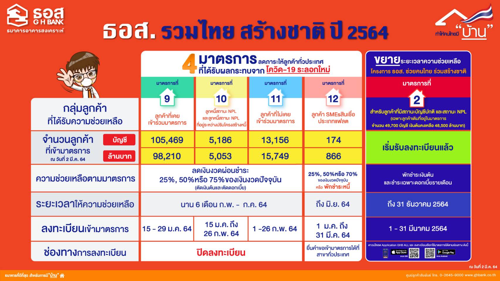 นอกจากนี้ เพื่อเป็นการบรรเทาความเดือดร้อนให้กับลูกค้าเดิมที่อยู่ระหว่างการได้รับความช่วยเหลือตาม “โครงการ ธอส. ช่วยคนไทย ร่วมสร้างชาติ” มาตรการที่ 2 พักชำระเงินต้นและชำระเฉพาะดอกเบี้ยรายเดือน เป็นระยะเวลา 1 ปี ซึ่งจะครบกำหนดระยะเวลาความช่วยเหลือในวันที่ 31 มีนาคม และ 30 เมษายน 2564 ธนาคารจึงเปิดให้ลูกค้าที่อยู่ในมาตรการดังกล่าว จำนวน 49,700 บัญชี เงินต้นคงเหลือ 48,500 ล้านบาท หากยังคงได้รับผลกระทบด้านรายได้จาก COVID-19 สามารถลงทะเบียนเป็นการเฉพาะ เพื่อแจ้งความประสงค์ในการ “ขยาย” ความช่วยเหลือตามมาตรการดังกล่าวต่อไปได้ จนถึงวันที่ 31 ธันวาคม 2564 โดยสามารถลงทะเบียนพร้อมกับ Upload หลักฐานยืนยันว่ามีผลกระทบทางรายได้ผ่าน Application : GHB ALL ระหว่างวันที่ 1-29 มีนาคม 2564 สอบถามรายละเอียดเพิ่มเติมที่ศูนย์ลูกค้าสัมพันธ์ (Call Center) โทร. 0-2645-9000, www.ghbank.co.th, Facebook Fanpage ธนาคารอาคารสงเคราะห์ และ Application : GHB ALL. – สำนักข่าวไทย