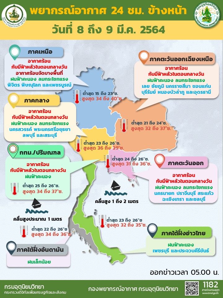กรมอุตุฯ 8 มี.ค. – กรมอุตุฯ เผยไทยตอนบน รวมทั้งกรุงเทพฯ-ปริมณฑล อากาศร้อน กับมีฟ้าหลัวตอนกลางวัน โดยมีฝนฟ้าคะนองและลมกระโชกแรงบางพื้นที่