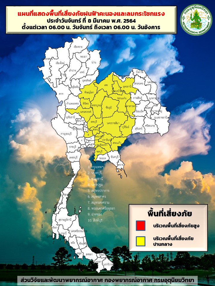 กรมอุตุนิยมวิทยา พยากรณ์อากาศ 24 ชั่วโมงข้างหน้า บริเวณความกดอากาศสูงกำลังปานกลางจากประเทศจีนได้แผ่ลงมาปกคลุมภาคตะวันออกเฉียงเหนือและทะเลจีนใต้ ในขณะที่ประเทศไทยตอนบนมีอากาศร้อน กับมีลมใต้และลมตะวันออกเฉียงใต้พัดนำความชื้นจากทะเลจีนใต้และอ่าวไทยเข้ามาปกคลุมภาคเหนือตอนล่าง ภาคตะวันออกเฉียงเหนือ ภาคกลาง และภาคตะวันออก รวมทั้งกรุงเทพมหานคร และปริมณฑล ลักษณะเช่นนี้ทำให้บริเวณประเทศไทยตอนบนมีอากาศร้อน กับมีฟ้าหลัวในตอนกลางวัน โดยมีฝนฟ้าคะนองและลมกระโชกแรงบางพื้นที่ของภาคเหนือตอนล่าง ภาคตะวันออกเฉียงเหนือ ภาคกลาง และภาคตะวันออก ส่วนภาคใต้มีฝนบางแห่ง เนื่องจากลมตะวันออกยังคงพัดปกคลุมอ่าวไทยและภาคใต้