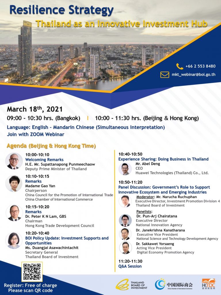 นางสาวดวงใจ อัศวจินตจิตร์ เลขาธิการคณะกรรมการส่งเสริมการลงทุน หรือ บีโอไอ เปิดเผยว่า บีโอไอร่วมกับ หอการค้าระหว่างประเทศของจีน (China Chamber of International Commerce) และสภาพัฒนาการค้าของฮ่องกง (Hong Kong Trade Development Council) กำหนดจัดสัมมนาออนไลน์ (Zoom Webinar) หัวข้อ “Resilience Strategy: Thailand as an Innovative Investment Hub” ในวันที่ 18 มีนาคม 2564 เวลา 09.00 – 10.30 น. เพื่อเผยแพร่นโยบายส่งเสริมการลงทุน โอกาสทางธุรกิจแก่นักลงทุนที่สนใจขยายการลงทุนมายังประเทศไทย โดยเฉพาะในกลุ่มอุตสาหกรรมนวัตกรรม และประสบการณ์การทำธุรกิจของบริษัทจีนในประเทศไทย โดยมีนายสุพัฒนพงษ์ พันธ์มีเชาว์ รองนายกรัฐมนตรี เป็นประธาน