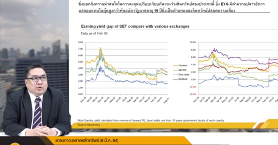 กรุงเทพ 8 มี.ค. – ตลท.เผยดัชนีตลาดหลักทรัพย์ไทยเดือน ก.พ.ปรับตัวดีขึ้นตามแนวโน้มการฟื้นตัวของเศรษฐกิจโลก และความหวังจากวัคซีนโควิด ขณะที่ตลาดหลักทรัพย์ทั่วโลกผันผวนจากอัตราผลตอบแทนพันธบัตรที่ปรับเพิ่มขึ้นสูงสุดในรอบ 12 เดือน กังวลปรับเพิ่มอัตราเงินเฟ้อ