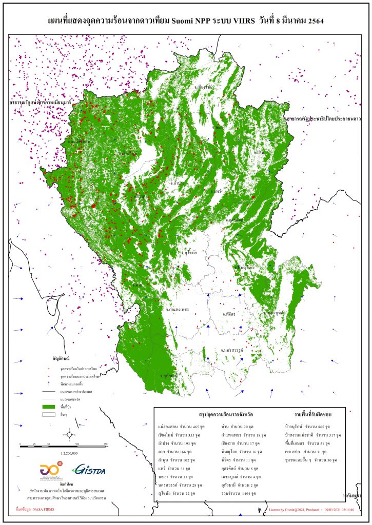 สำนักงานพัฒนาเทคโนโลยีอวกาศและภูมิสารสนเทศ (GISTDA) รายงานผลการเกิดจุดความร้อนจากดาวเทียม Suomi NPP ระบบ VIIRS บันทึกข้อมูลวานนี้ (8 มี.ค.) ปรากฏว่า จุดความร้อนภาคเหนือ 1,494 จุด พบมากที่สุดที่ จังหวัดแม่ฮ่องสอน 465 จุด เชียงใหม่ 355 จุด และลำปาง 193 จุด หากจำแนกจุดความร้อนตามการใช้ประโยชน์ที่ดินพบว่า มีในป่าอนุรักษ์ 865 จุด (ป่าคงสภาพ 836 จุดและเกษตรในป่า 29 จุด) ป่าสงวนแห่งชาติ 517 จุด (ป่าคงสภาพ 432 จุดและเกษตรในป่า 85 จุด) พื้นที่เกษตร 82 จุด และพื้นที่ชุมชน 30 จุด ส่วนจุดความร้อนรายประเทศพบมากที่สุดที่ สาธารณรัฐแห่งสหภาพเมียนมาร์ 6,336 จุด ไทย 1,737 จุด และกัมพูชา 1,531 จุด จึงมอบหมายให้กรมควบคุมมลพิษเฝ้าระวังผลกระทบจากหมอกควันข้ามแดนที่มีแนวโน้มส่งผลกระทบต่อจังหวัดในภาคเหนือตอนบน โดยให้ประสานไปยังสำนักงานเลขาธิการอาเซียนเพื่อขอความร่วมมือจากประเทศเพื่อนบ้านในการลดและควบคุมการเผาในที่โล่ง