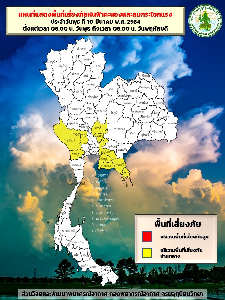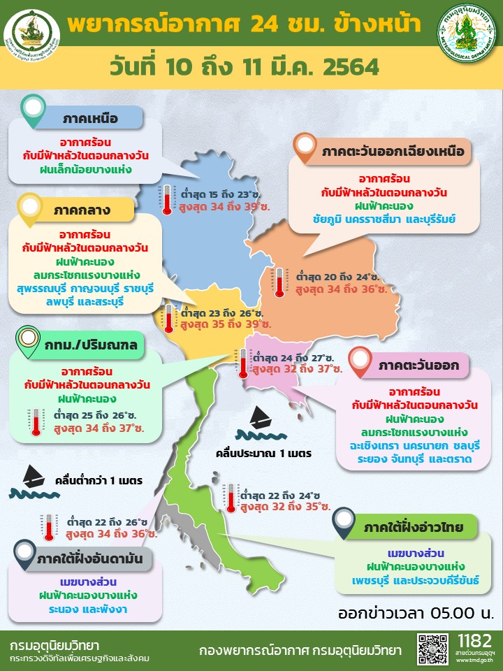 กรมอุตุฯ 10 มี.ค. – กรมอุตุฯ เผยภาคอีสาน ภาคกลาง ภาคตะวันออก มีฝนฟ้าคะนองและลมกระโชกแรงบางพื้นที่ ส่วนกรุงเทพฯ-ปริมณฑล ฝนฟ้าคะนอง 20% ของพื้นที่ ขณะที่ภาคใต้มีฝนน้อย