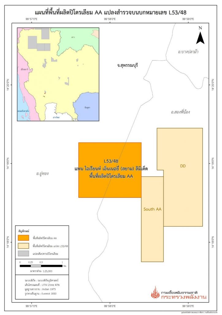 นายศุภลักษณ์ พาฬอนุรักษ์ โฆษกกรมเชื้อเพลิงธรรมชาติ เปิดเผยว่า คณะกรรมการปิโตรเลียม ในการประชุมเมื่อวันที่ 24 กุมภาพันธ์ 2564 ที่ผ่านมา มีมติเห็นชอบให้มีการอนุมัติกำหนดพื้นที่ผลิตปิโตรเลียม AA ขนาดพื้นที่ 1.86 ตารางกิโลเมตร ซึ่งอยู่ในแปลงสำรวจบนบกหมายเลข L53/48 (บริเวณจังหวัดกาญจนบุรี นครปฐม และสุพรรณบุรี) เพิ่มเติมอีกจำนวน 1 พื้นที่ จากเดิมที่ได้รับการอนุมัติมาแล้วจำนวน 6 พื้นที่ ได้แก่ พื้นที่ผลิตปิโตรเลียม L53A, L53D, L53G, L53B, DD และ South AA โดยรวมทั้งสิ้นเป็น 7 พื้นที่ผลิตฯ ซึ่งมีบริษัท แพน โอเรียนท์ เอ็นเนอยี่ (สยาม) ลิมิเต็ด เป็นผู้รับสัมปทาน