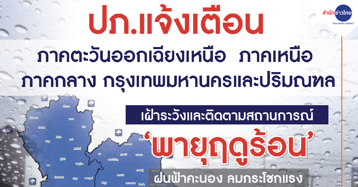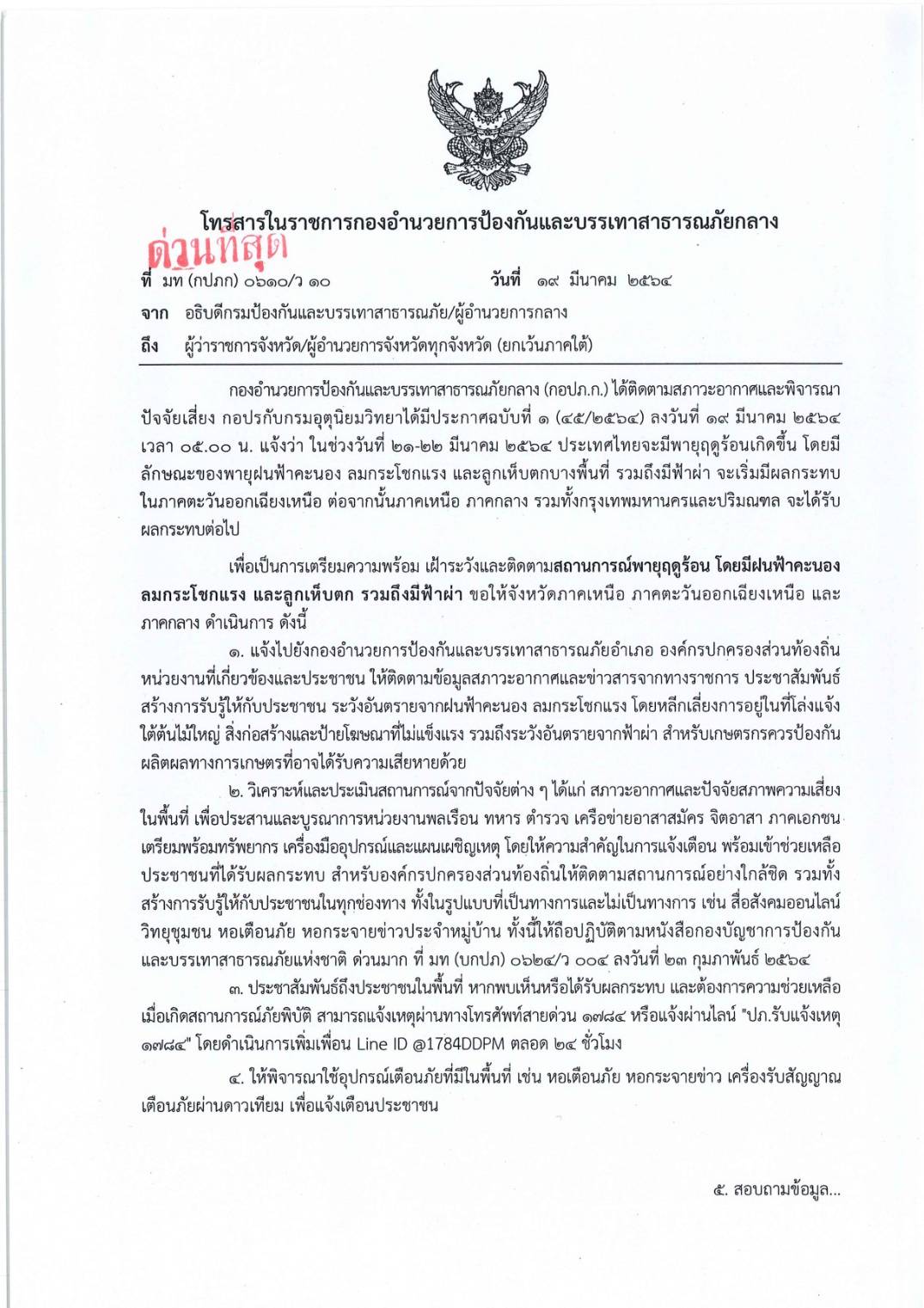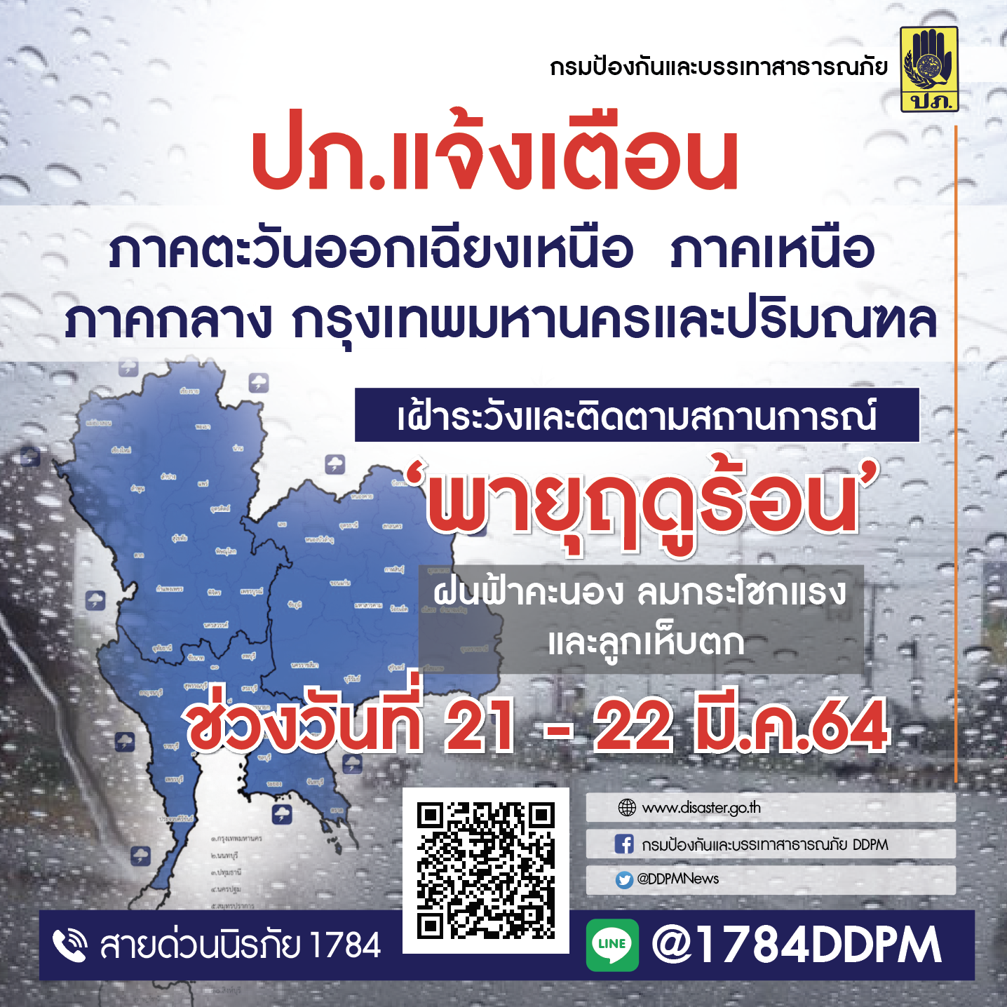 ปภ. 19 มี.ค. – ปภ.เตือนจังหวัดภาคอีสาน ภาคเหนือ ภาคกลาง กรุงเทพฯ และปริมณฑล เฝ้าระวังและเตรียมรับมือพายุฤดูร้อน ช่วงวันที่ 21-22 มี.ค.นี้