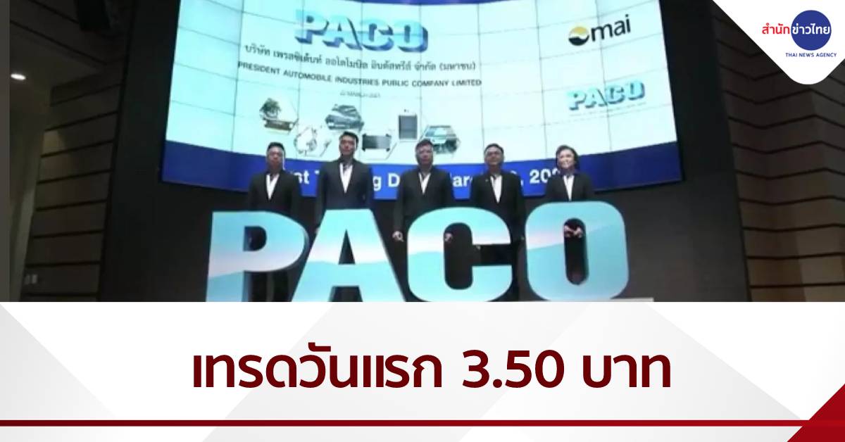 ตลาดหลักทรัพย์แห่งประเทศไทย 22 มี.ค. – PACO เข้าซื้อขายในตลาดเอ็มเอไอ เทรดวันแรก 3.50 บาท บาท เพิ่มขึ้น 150% จากราคา IPO 1.40 บาทต่อหุ้น