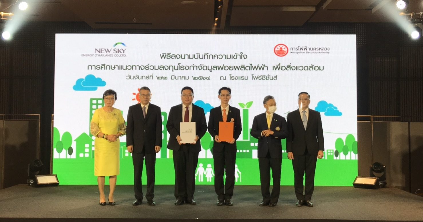 กรุงเทพฯ 22 มี.ค. – การไฟฟ้านครหลวง ร่วมมือกับ นิวสกาย เอ็นเนอร์จี ลงนามเอ็มโอยู ศึกษาแนวทางร่วมทุนโรงกำจัดขยะมูลฝอยผลิตไฟฟ้าเพื่อสิ่งแวดล้อม
