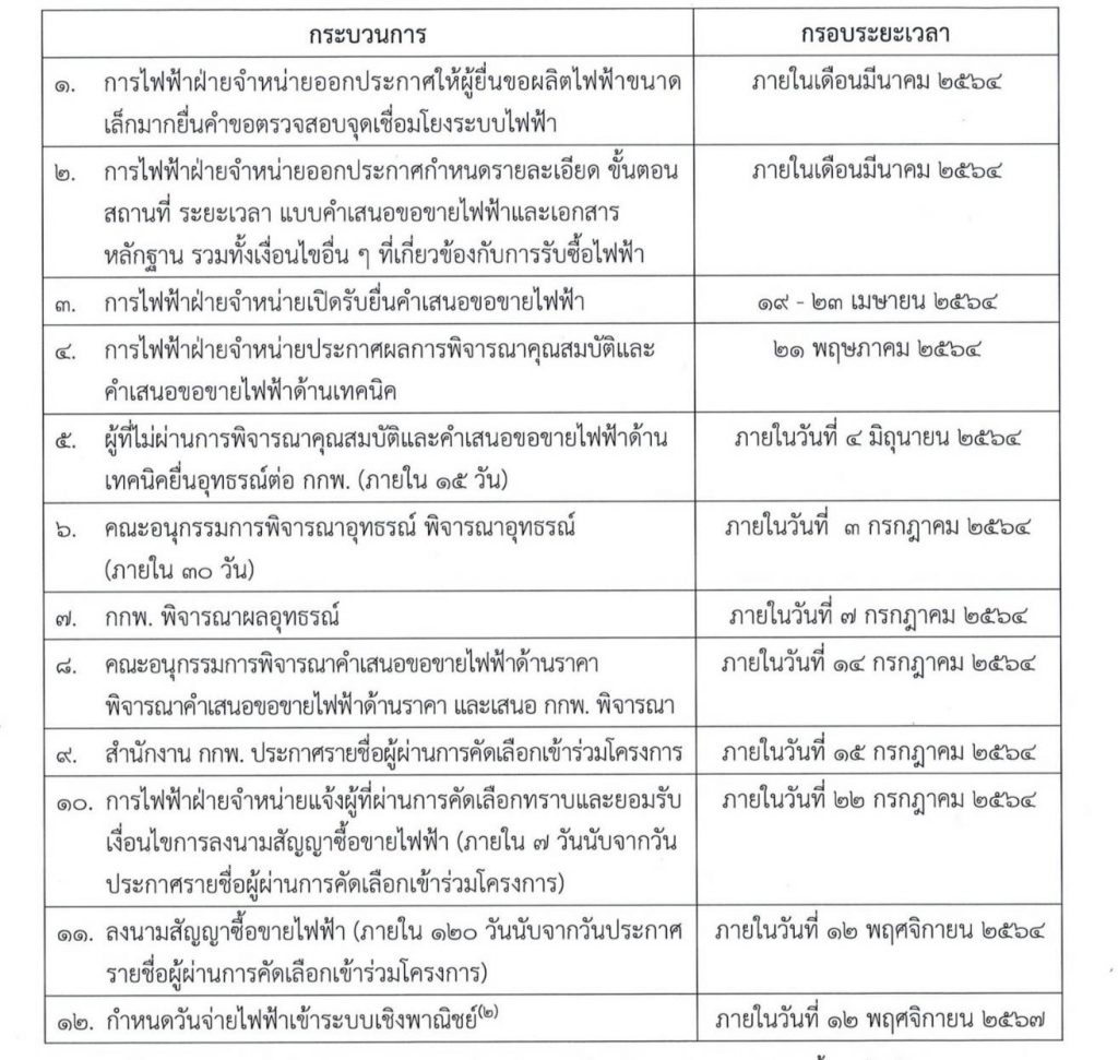 นายเสมอใจ ศุขสุเมฆ ประธานกรรมการกำกับกิจการพลังงานลงนามประกาศคณะกรรมการกำกับกิจการพลังงาน เรื่อง ประกาศเชิญชวนรับซื้อไฟฟ้าจากผู้ผลิตไฟฟ้าขนาดเล็กมากโครงการโรงไฟฟ้าชุมชนเพื่อเศรษฐกิจฐานราก (โครงการนำร่อง) 150เมกะวัตต์ แยกเป็นโรงไฟฟ้าขีวมวลและก๊าซชีวภาพอย่างละครึ่ง โดยการไฟฟ้าฝ่ายจำหน่ายเปิดรับยื่นคำเสนอขอขายไฟฟ้า19 – 23 เม.ย. 64 และประกาศผลการพิจารณาคุณสมบัติและคำเสนอขอขายไฟฟ้าด้านเทคนิควันที่ 21 พ.ค. 64 ส่วนกำหนดลงนามสัญญาซื้อขายไฟฟ้า (ภายใน 120วันนับจากวันประกาศ) ภายในวันที่ 12 พ.ย.64 ด้านกำหนดวันจ่ายไฟฟ้าเข้าระบบเชิงพาณิชย์(๒) ภายในวันที่ 12พฤศจิกายน 67 . – สำนักข่าวไทย