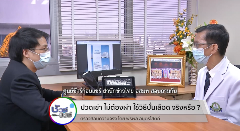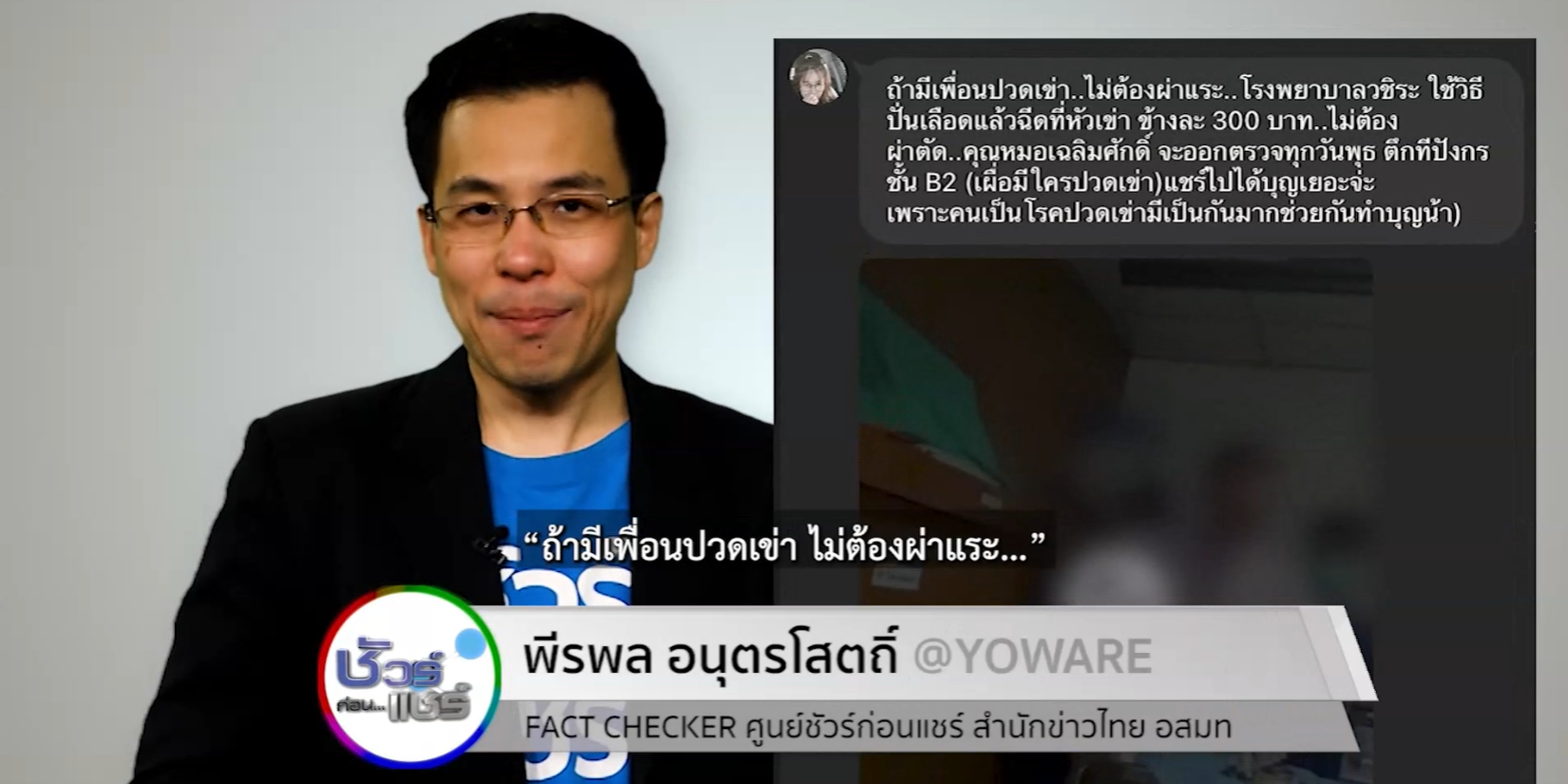 29 มี.ค. – บนสังคมออนไลน์แชร์คลิปพร้อมข้อความว่า ถ้ามีเพื่อนปวดเข่า ไม่ต้องผ่าแล้ว โรงพยาบาลวชิระใช้วิธีปั่นเลือดแล้วฉีดที่หัวเข่า ข้างละ 300 บาท ไม่ต้องผ่าตัด เรื่องนี้จริงหรือไม่ ติดตามกับคุณพีรพล อนุตรโสตถิ์ จากศูนย์ชัวร์ก่อนแชร์