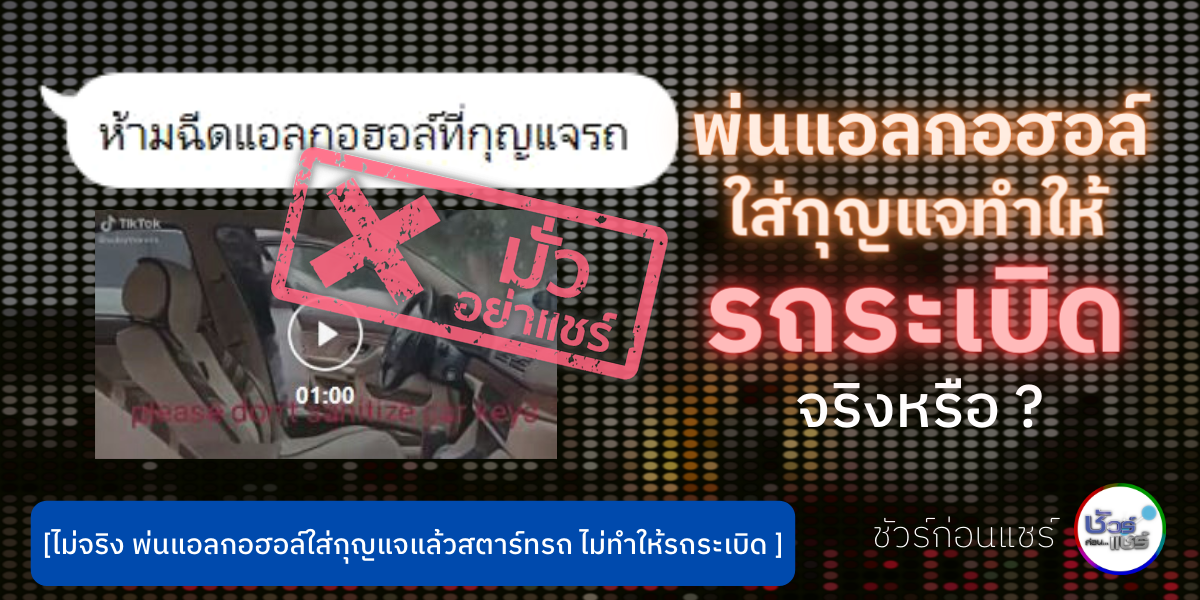 ศูนย์ชัวร์ก่อนแชร์ สำนักข่าวไทย อสมท ตรวจสอบกับ ดร.ภุชงค์ ศรีอ่วม วิศวกรความปลอดภัยในการทำงาน ศูนย์ความปลอดภัยอาชีวอนามัยและสิ่งแวดล้อม จุฬาลงกรณ์มหาวิทยาลัย (SHE CU) ได้รับการยืนยันว่า “การพ่นแอลกอฮอล์ใส่กุญแจแล้วสตาร์ทรถ ไม่ทำให้รถระเบิด แต่แอลกอฮอล์เป็นสารไวไฟ สามารถติดไฟได้จริง ควรใช้อย่างพอดี และจัดเก็บอย่างระมัดระวัง”