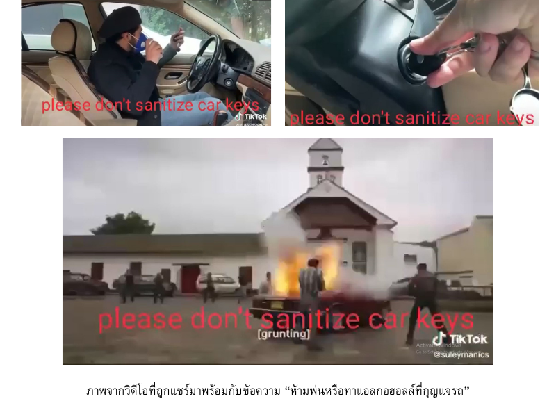 คลิปวิดีโอความยาว 1 นาที ถูกแชร์มาพร้อมข้อความระบุว่า “ห้ามพ่นหรือทาแอลกอฮอลล์ที่กุญแจรถ” โดยในคลิปวิดีโอมีภาพชายคนหนึ่งพ่นสเปรย์แอลกอฮอล์ปริมาณมากใส่กุญแจรถและภายในรถ เมื่อสตาร์ทรถ ภาพเปลี่ยนเป็นเหตุการณ์รถระเบิดอย่างรุนแรง ศูนย์ชัวร์ก่อนแชร์ สืบหาต้นตอคลิปวิดีโอดังกล่าว พบคลิปต้นฉบับ บนแอปพลิเคชัน TikTok อัปโหลดตั้งแต่วันที่ 8 เมษายน 2563 โดยผู้ใช้ที่ชื่อว่า @suleymanics ซึ่งอาศัยอยู่ที่สาธารณรัฐอาเซอร์ไบจาน