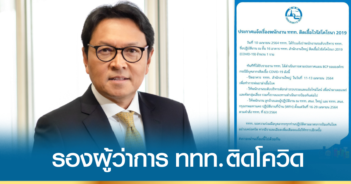 การท่องเที่ยวแห่งประเทศไทย (ททท.) ออกประกาศว่า เมื่อวันที่ 10 เมษายน 2564 ททท.ได้รับแจ้งว่า พนักงานระดับบริหาร ททท. ซึ่งปฏิบัติงาน ณ ชั้น 16 อาคาร ททท. สำนักงานใหญ่ ติดเชื้อไวรัสโคโรนา 2019 (COVID-19) จำนวน 1 ราย