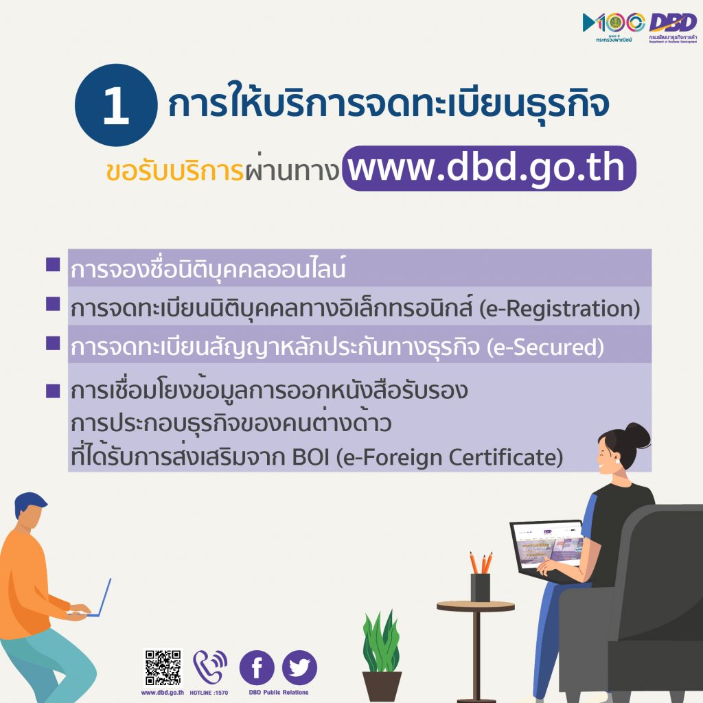 1. การให้บริการจดทะเบียนธุรกิจ โดยภาคธุรกิจและประชาชนสามารถขอรับบริการผ่านทางเว็บไซต์ของกรมพัฒนาธุรกิจการค้า (www.dbd.go.th) ได้อย่างครบวงจร ตั้งแต่การจองชื่อนิติบุคคลออนไลน์ การจดทะเบียนนิติบุคคลทางอิเล็กทรอนิกส์ (e-Registration) การจดทะเบียนสัญญาหลักประกันทางธุรกิจ (e-Secured) และการเชื่อมโยงข้อมูลการออกหนังสือรับรองการประกอบธุรกิจของคนต่างด้าวที่ได้รับการส่งเสริมจาก BOI (e-Foreign Certificate)