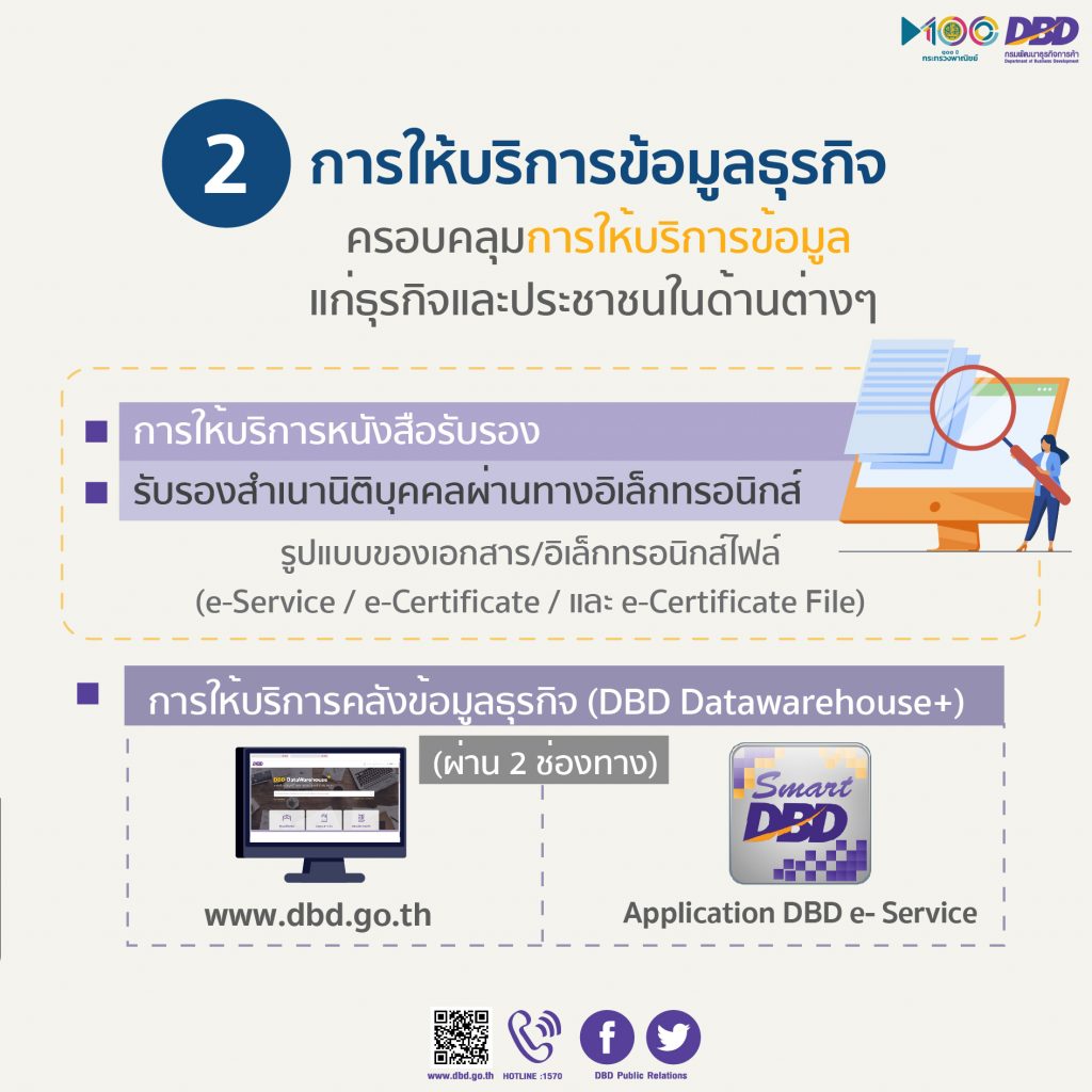 2. การให้บริการข้อมูลธุรกิจ ครอบคลุมการให้บริการข้อมูลแก่ภาคธุรกิจและประชาชนในด้านต่างๆ ได้แก่ การให้บริการหนังสือรับรอง รับรองสำเนานิติบุคคลผ่านทางอิเล็กทรอนิกส์ ทั้งในรูปแบบของเอกสารและอิเล็กทรอนิกส์ไฟล์ (e-Service / e-Certificate / e-Certificate File) การให้บริการคลังข้อมูลธุรกิจ (DBD Datawarehouse+) ผ่านทางเว็บไซต์ และ แอพพลิเคชั่น DBD e-Service ทั้งระบบ Android และ IOS