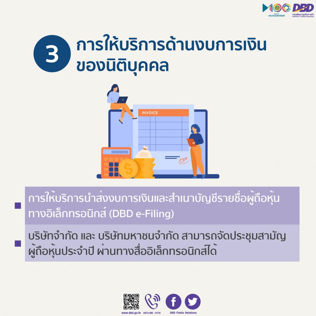 3. การให้บริการด้านงบการเงินของนิติบุคคล ได้แก่ การให้บริการนำส่งงบการเงินและสำเนาบัญชีรายชื่อผู้ถือหุ้นทางอิเล็กทรอนิกส์ (DBD e-Filing) ซึ่งบริษัทจำกัดและบริษัทมหาชนจำกัด สามารถจัดประชุมสามัญผู้ถือหุ้นประจำปี ผ่านทางสื่ออิเล็กทรอนิกส์ได้ เสมือนการจัดประชุมสามัญผู้ถือหุ้นประจำปีที่ได้เดินทางไปยังสถานที่จัดประชุม โดยปฏิบัติตามพระราชกำหนดว่าด้วยการประชุมผ่านสื่ออิเล็กทรอนิกส์ พ.ศ. 2563 ที่ได้ออกประกาศใช้ตั้งแต่วันที่ 19 เมษายน 2563 เป็นต้นมา (รายละเอียดดูได้จาก http://www.ratchakitcha.soc.go.th/DATA/PDF/2563/A/030/T_0020.PDF) ซึ่งจะทำให้มีผลตามกฎหมายทุกประการ ดังนั้น หากบริษัทใดที่ยังไม่ได้จัดประชุมสามัญผู้ถือหุ้น ก็สามารถจัดประชุมผู้ถือหุ้นผ่านสื่ออิเล็กทรอนิกส์ได้ และเมื่อดำเนินการทุกอย่างเรียบร้อยแล้ว ขอให้นิติบุคคลนำส่งงบการเงินผ่านระบบ DBD e-filing ของกรมพัฒนาธุรกิจการค้า เพื่อความสะดวกรวดเร็ว และสร้างความเชื่อมั่นให้กับคู่ค้าทางธุรกิจ ซึ่งสามารถนำข้อมูลที่ได้นำส่งไปใช้ประโยชน์ได้ในเชิงธุรกิจ