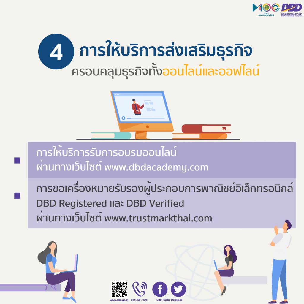 4. การให้บริการส่งเสริมธุรกิจ ครอบคลุมธุรกิจทั้งออนไลน์และออฟไลน์ เช่น การให้บริการรับการอบรมออนไลน์ผ่านทางเว็บไซต์ DBD Academy (www.dbdacademy.com) และการขอเครื่องหมายรับรองผู้ประกอบการพาณิชย์อิเล็กทรอนิกส์ DBD Registered และ DBD Verified ผ่านทาง www.Trustmarkthai.com