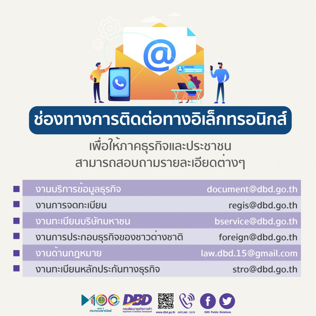 ทั้งนี้ ในส่วนของมาตรการเฝ้าระวังการแพร่ระบาดของโควิด-19 ในพื้นที่ปฏิบัติงานและการให้บริการต่างๆ กรมฯ ได้จัดให้เจ้าหน้าที่มีการสลับหมุนเวียนการปฏิบัติงาน โดยส่วนหนึ่งให้ปฏิบัติงาน ณ สถานที่พัก (Work from Home : WFH) เพื่อลดความเสี่ยงจากการสัมผัสใกล้ชิด ซึ่งภาคธุรกิจและประชาชนที่ขอรับบริการจะไม่ได้รับผลกระทบใดๆ และกรมฯ สามารถให้บริการได้อย่างมีประสิทธิภาพเช่นเดิม โดยได้เปิดช่องทางการติดต่อทางอิเล็กทรอนิกส์เพื่อให้ภาคธุรกิจและประชาชนสามารถสอบถามรายละเอียดต่างๆ ได้ ประกอบด้วย *งานบริการข้อมูลธุรกิจ document@dbd.go.th *งานการจดทะเบียนนิติบุคคล regis@dbd.go.th *งานทะเบียนบริษัทมหาชน bservice@dbd.go.th *งานการประกอบธุรกิจของชาวต่างชาติ foreign@dbd.go.th *งานด้านกฎหมาย law.dbd.15@gmail.com และ *งานทะเบียนหลักประกันทางธุรกิจ stro@dbd.go.th