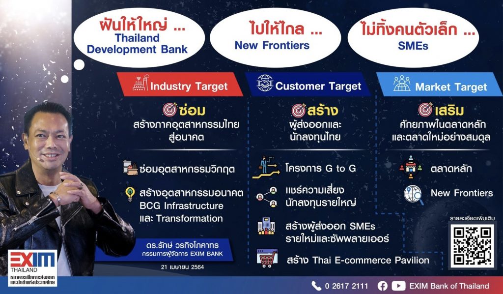นายรักษ์ กล่าวเพิ่มเติมว่า EXIM BANK จึงต้องปรับบทบาททำหน้าที่ “เครื่องยนต์รุ่นใหม่” ผลักดันให้ประเทศไทยหลุดจากภาวะติดหล่มข้างต้น ผ่านนโยบาย Dual-track Policy ชูบทบาท “ธนาคารเพื่อการพัฒนาแห่งประเทศไทย (Thailand Development Bank)” ควบคู่กับการเป็น “ศูนย์บริการครบวงจรเพื่ออำนวยความสะดวกทางการค้าระหว่างประเทศให้แก่ SMEs (One Stop Trading Facilitator for SMEs) โดยภารกิจหลักของ EXIM BANK ในปี 2564 ได้แก่ การเร่ง “ซ่อม สร้าง เสริม” การพัฒนาประเทศไทยด้วยการ 1. การเร่ง “ซ่อม” และ “สร้าง” ภาคอุตสาหกรรมของไทยให้เติบโตไปสู่อนาคต ประคับประคองผู้ประกอบการในภาคอุตสาหกรรมที่ประสบวิกฤต สร้างอุตสาหกรรมใหม่ อาทิ อุตสาหกรรมแห่งอนาคต (เช่น เทคโนโลยีด้านสุขภาพ รถยนต์ไฟฟ้า) เศรษฐกิจชีวภาพ เศรษฐกิจหมุนเวียน และเศรษฐกิจสีเขียว (Bio-Circular-Green Economy) โครงสร้างพื้นฐาน และการปรับโครงสร้างภาคอุตสาหกรรมขนานใหญ่