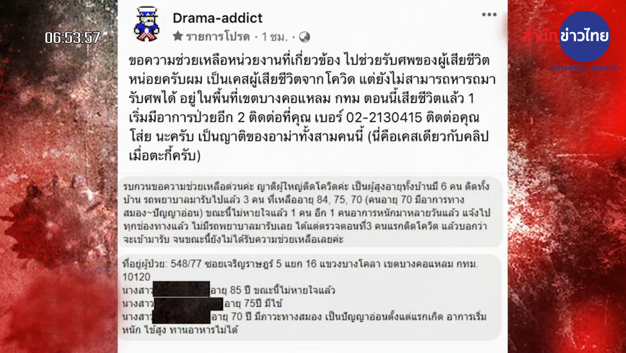เพจเฟซบุ๊ก Drama-addict โพสต์และแชร์คลิป TikTok ว่ามีหญิงชรา 3 คน ติดเชื้อโควิด-19 อยู่ที่บ้านพักใน ซ.วัดไผ่เงิน เขตบางคอแหลม กทม. โดยหญิงชรา หรืออาม่า 3 คน เป็นพี่น้องกัน ติดเชื้อโควิด-19 กักตัวอยู่ที่บ้าน เพราะไม่มีเตียงรักษา อยู่มาหลายวัน อาการทรุดลง แต่ยังไม่มีรถพยาบาลมารับ จนทำให้หญิงชรา 1 ใน 3 คน เสียชีวิตภายในบ้านพัก โดยมีอีก 2 คน นั่งอยู่ใกล้ๆ พูดในคลิปถึงอาม่าคนที่แน่นิ่งไปว่า “ช่วยด้วย 3-4 วันแล้วไม่ได้กินเลย และหลายชั่วโมงแล้วไม่ยอมตื่นเลย”