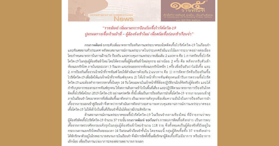 กรมราชทัณฑ์ 23 เม.ย.-กรมราชทัณฑ์ ออกมาตรการเพิ่ม 2 แนวทางป้องกันโควิดแพร่ระบาดในเรือนจำทั่วประเทศ ส่วนกรณีพบ 37 ผู้ต้องขังในเรือนจำกลางเชียงใหม่ติดเชื้อโควิด เป็นการตรวจคัดกรองเชิงรุกในกลุ่มเข้าใหม่จาก 118 ราย ขณะนี้พักรักษาตัวอยู่ใน รพ.สนามภายในเรือนจำ