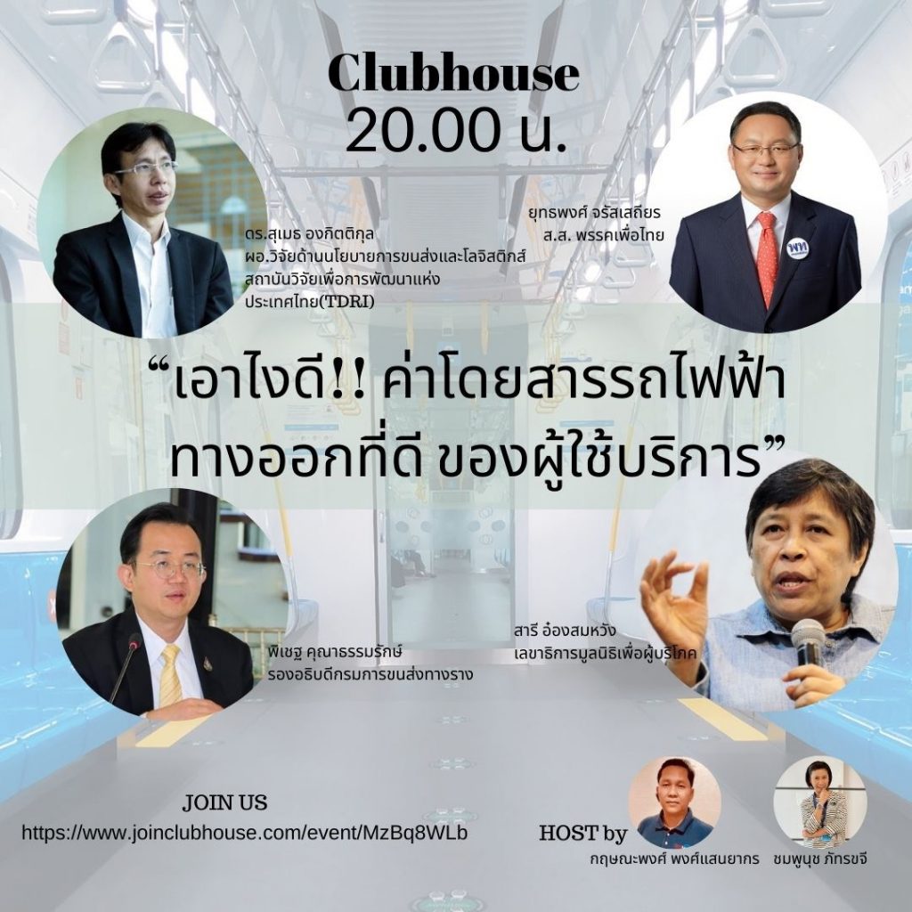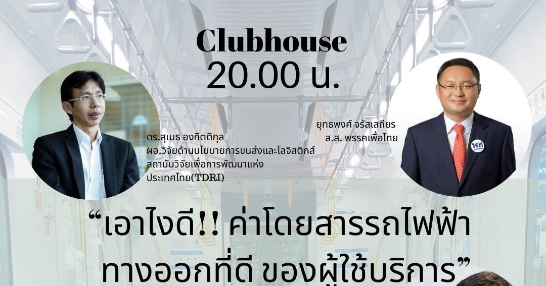 ผู้สื่อข่าวรายงานว่า การจัดเสวนาทางคลับเฮ้าส์ หัวข้อเรื่อง “เอาไงดี ! ค่าโดยสารรถไฟฟ้า ทางออกที่ดีของผู้ใช้บริการ” ซึ่งมีหลายภาคส่วนเข้าร่วม ประกอบด้วย นางสาวสารี อ๋องสมหวัง จากสภาองค์กรของผู้บริโภค นายพิเชฐ คุณาธรรมรักษ์ รองอธิบดีกรมการขนส่งทางราง นายสุเมธ องกิตติกุล ผู้อำนวยการวิจัยนโยบายด้านการขนส่งและโลจิสติกส์ สถาบันวิจัยเพื่อการพัฒนาประเทศไทย (TDRI) และนายยุทธพงศ์ จรัสเสถียร รองหัวหน้าพรรคเพื่อไทย เข้าร่วม