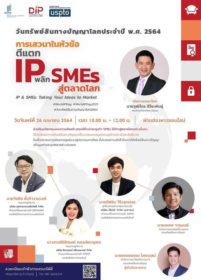 แนวคิดในปีนี้ เหมาะสมกับบริบทประเทศไทยเป็นอย่างยิ่ง เนื่องจากปัจจุบัน SMEs มีบทบาทและเป็นกำลังสำคัญในการขับเคลื่อนเศรษฐกิจของไทย ซึ่งการนำความคิดสร้างสรรค์และนวัตกรรมที่เป็นทรัพย์สินทางปัญญามาใช้ประโยชน์ เพื่อสร้างจุดแข็งทางธุรกิจให้ก้าวไปสู่ตลาดโลกอย่างมั่นคง พร้อมเผชิญความท้าทายของการค้าในยุคหลังโควิด 19 และเพื่อร่วมเฉลิมฉลองโอกาสดังกล่าว กรมทรัพย์สินทางปัญญาได้จัดเสวนาออนไลน์ในหัวข้อ “ตีแตก IP พลิก SMEs สู่ตลาดโลก” โดยได้รับเกียรติจากวิทยากร อาทิ นางสาวศิริลักษณ์ ณรงค์ตะณุพล เจ้าของแบรนด์ PiPPER ผลิตภัณฑ์ทำความสะอาดจากธรรมชาติ นายจิรชัย ตั้งกิจงามวงศ์ เจ้าของแบรนด์ DEESAWAT เฟอร์นิเจอร์และของตกแต่งบ้านที่มีดีไซน์โดดเด่น และนายฉัตริน จีรังสุวรรณ จากบริษัท เซ็ปเป้ จำกัด (มหาชน) เป็นต้น ซึ่งเป็นผู้ที่ประสบความสำเร็จในการนำทรัพย์สินทางปัญญามาใช้เป็นเครื่องมือในการสร้างโอกาสทางธุรกิจและบุกตลาดต่างประเทศ