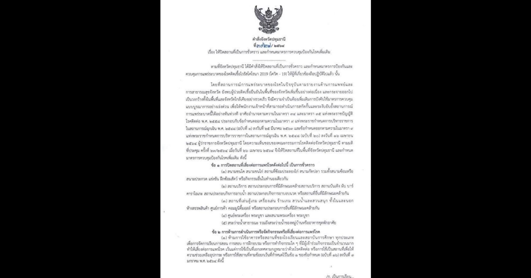 กทม. 26 เม.ย.- อีกจังหวัด! ปทุมธานี งัดมาตรการเข้มป้องกันโควิด ออกคำสั่งปิดสถานที่เสี่ยง – ห้ามจัดกิจกรรมรวมกลุ่มมากกว่า 10 คนเว้นได้รับอนุญาต พร้อมขอความร่วมมือประชาชนงดออกนอกเคหสถาน ระหว่าง 21.00-04.00 น.เริ่มมีผลตั้งแต่ 27 เม.ย.เป็นต้นไป