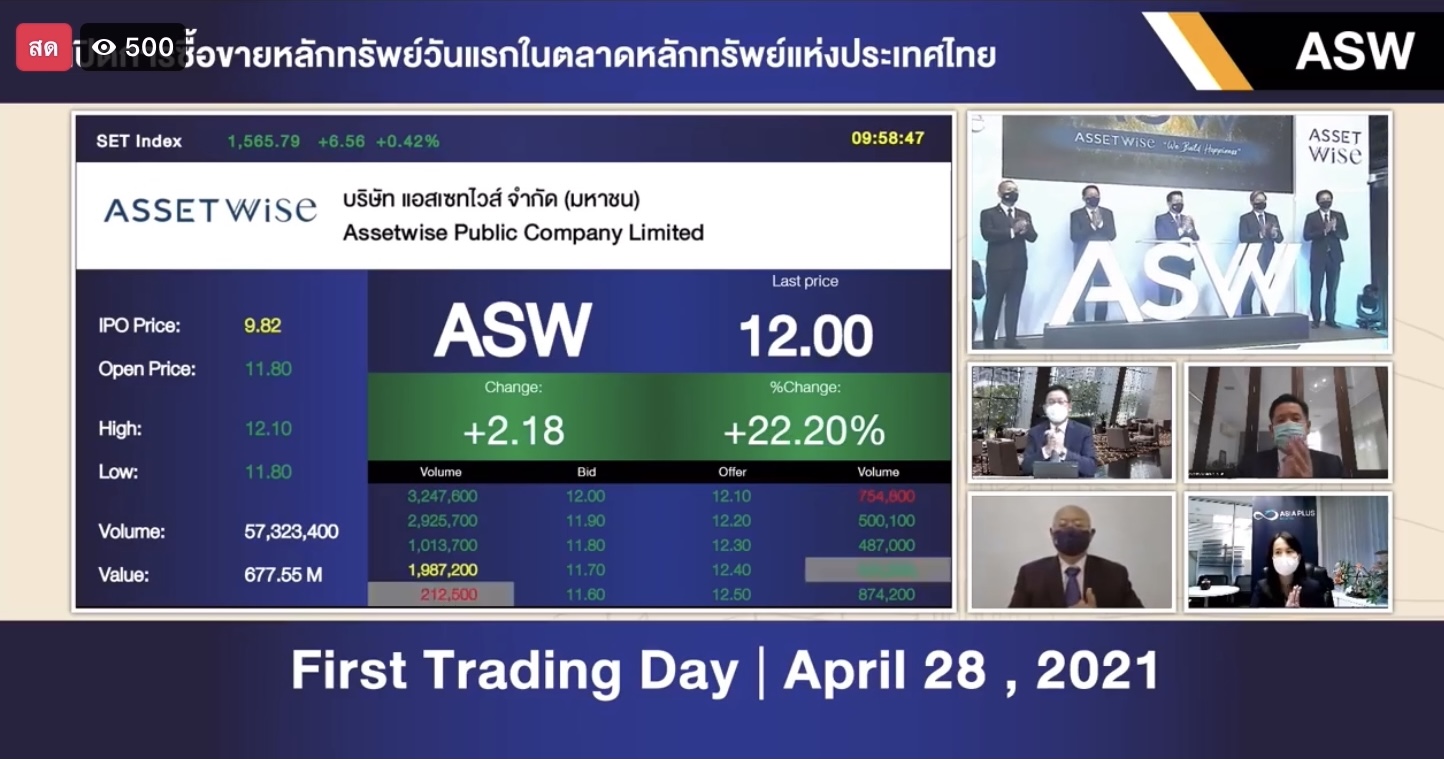 บริษัท แอสเซทไวส์ จำกัด (มหาชน) หรือ ASW เข้าซื้อขายในตลาดหลักทรัพย์แห่งประเทศไทยวันนี้ (28 เม.ย.2564) เป็นวันแรก พบว่า ราคาหุ้นเปิดการซื้อขายที่ 11.80 บาทต่อหุ้น ปรับขึ้น 1.98 บาท หรือปรับขึ้น 20.16% จากราคาจองซื้อที่ 9.82 บาทต่อหุ้น