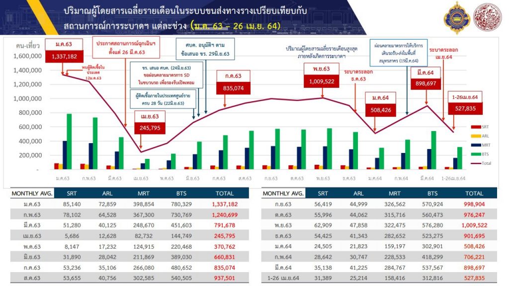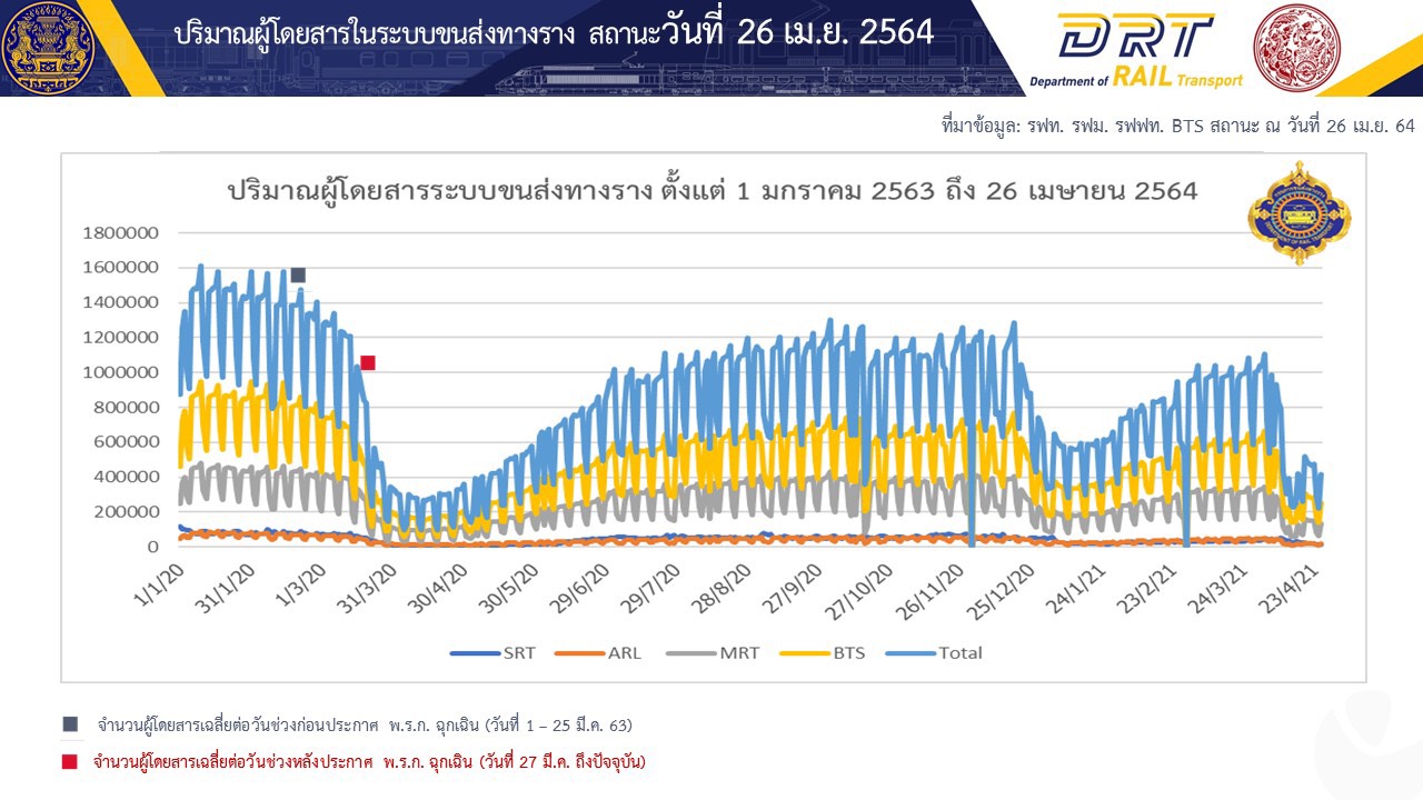 นายกิตติพันธ์ ปานจันทร์ อธิบดีกรมการขนส่งทางราง (ขร.) เปิดเผยข้อมูลปริมาณเฉลี่ยผู้โดยสารรายเดือนในระบบขนส่งทางราง ประกอบด้วย การรถไฟแห่งประเทศไทย (SRT) การรถไฟฟ้าขนส่งมวลชนแห่งประเทศไทย (MRT) บริษัท รถไฟฟ้า ร.ฟ.ท. จำกัด (ARL) และรถไฟฟ้า BTS ในสถานการณ์ของการแพร่ระบาดของเชื้อไวรัสโควิด-19 โดยเริ่มเข้ามาระบาดประเทศไทยตั้งแต่ช่วงเดือนมกราคม 2563 ซึ่งส่งผลให้การใช้บริการระบบขนส่งทางรางมีปริมาณน้อยลงอย่างเห็นได้ชัด จากตัวเลขที่มีค่าเฉลี่ยกว่า 1.3 ล้านคน/วัน โดยที่ผ่านมาในเดือนเมษายน 2563 มีตัวเลขผู้โดยสารลดลงมากที่สุดเหลือเพียงเฉลี่ย 2 แสนคน/วัน โดยตัวเลขล่าสุดพบค่าเฉลี่ยจำนวนผู้เดินทางต่อวันลดลงในเดือนเมษายน 2564 (1-26 เม.ย.) เหลือผู้โดยสาร เฉลี่ย 527,835 คนต่อวัน จากระดับที่เคยมีผู้โดยสารเฉลี่ยวันละ 1,337,182 คนต่อวันในเดือน ม.ค.2563