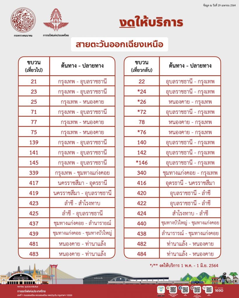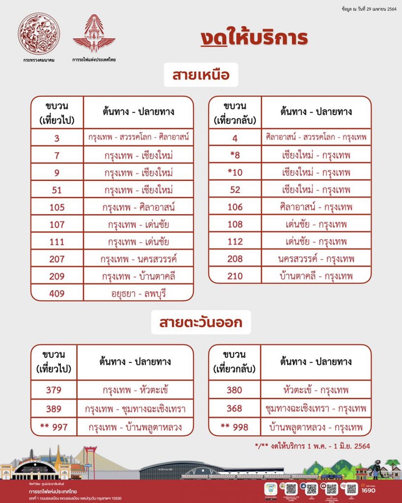 นายเอกรัช ศรีอาระยันพงษ์ ผู้อำนวยการศูนย์ประชาสัมพันธ์ การรถไฟแห่งประเทศไทย เปิดเผยว่า ตามที่ศูนย์บริหารสถานการณ์การแพร่ระบาดของโรคติดเชื้อไวรัสโคโรนา 2019 (ศบค.) มีนโยบายขอความร่วมมือให้ประชาชนหลีกเลี่ยงหรือชะลอการเดินทาง เพื่อยับยั้งการแพร่ระบาดของโรคติดเชื้อไวรัสโควิด-19 ระลอกใหม่ การรถไฟฯ จึงมีการปรับเปลี่ยนขบวนรถที่ให้บริการเส้นทางต่างๆ ให้มีความเหมาะสมต่อสถานการณ์ โดยงดการให้บริการขบวนรถเชิงพาณิชย์ (รถทางไกล) ขบวนรถเชิงสังคม (รถระยะสั้น) รวมทั้งสิ้น 121 ขบวน เริ่มตั้งแต่วันที่ 30 เมษายน – 31 พฤษภาคม 2564