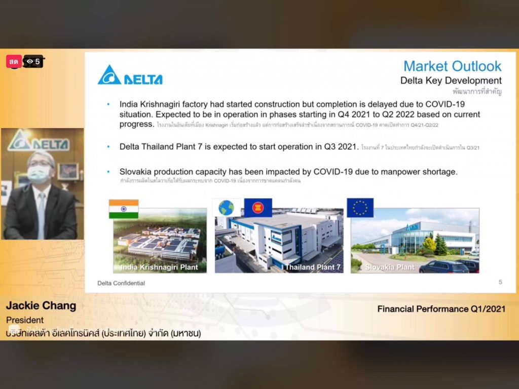 อย่างไรก็ตามสถานการณ์โควิด-19 ในประเทศอินเดียมีความรุนแรงอย่างมาก ส่งผลกระทบต่อการก่อสร้างโรงงานแห่งใหม่ของบริษัทในเมือง Krishnagiri ต้องล่าช้าออกไป คาดว่าต้องเลื่อนออกไปเป็นช่วงไตรมาส 2/65 จากเดิมคาดว่าจะเปิดได้ในไตรมาส 4/64 ส่วนโรงงานแห่งที่ 7 ในประเทศไทย ซึ่งอยู่ระหว่างการก่อสร้าง อาจได้รับผลกระทบโควิด-19 ระลอก 3 เล็กน้อย ทำให้ต้องเลื่อนไปเปิดในช่วงไตรมาส 4/64 จากกำหนดเดิมในไตรมาส 3/64 การเลื่อนเปิดโรงงานแห่งใหม่เพื่อขยายกำลังการผลิตคงไม่กระทบต่อภาพรวมของผลการดำเนินงานของบริษัทในปีนี้มากนัก โดยยังมั่นใจว่ารายได้จะเติบโตตามเป้าหมาย 5-10% จากปีก่อนที่มีรายได้ 2 พันล้านดอลลาร์สหรัฐฯ หลังจากรายได้ในช่วงไตรมาส 1/2564 ยังเติบโตได้ดี จากความต้องการชิ้นส่วนรถยนต์ไฟฟ้าและอุปกรณ์ไอทีต่างๆ ที่มีผู้ผลิตส่งคำสั่งซื้อเข้ามาต่อเนื่อง เป็นปัจจัยที่สนับสนุนการเติบโตให้กับบริษัทในปีนี