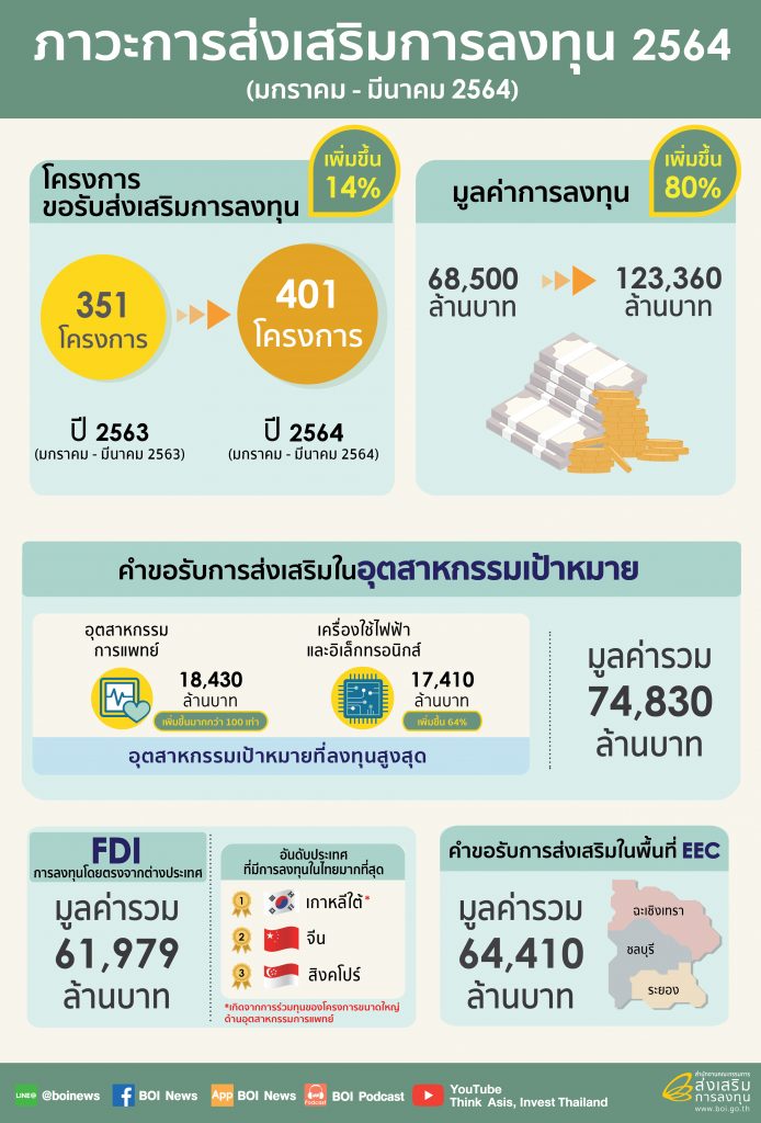 น.ส.ดวงใจ อัศวจินตจิตร์ เลขาธิการคณะกรรมการส่งเสริมการลงทุน หรือ บีโอไอ เปิดเผยว่า การลงทุนในช่วงไตรมาสแรก (ม.ค.- มี.ค.) ปี 2564 มีคำขอรับการส่งเสริมการลงทุนจำนวน 401 โครงการ มูลค่าลงทุนรวม 123,360 ล้านบาท มีอัตราเติบโตทั้งจำนวนโครงการและมูลค่าการลงทุนเมื่อเทียบกับ ช่วงไตรมาสแรกของปี 2563 โดยจำนวนโครงการเติบโตร้อยละ 14 และมูลค่าเติบโตร้อยละ 80 กลุ่มอุตสาหกรรมเป้าหมายที่เป็นกลไกขับเคลื่อนเศรษฐกิจมีมูลค่าลงทุนทั้งสิ้น 74,830 ล้านบาท โดย 2 อันดับแรกที่มีมูลค่าการขอรับการส่งเสริมสูงสุด ได้แก่ 1) อุตสาหกรรมการแพทย์ มูลค่า 18,430 ล้านบาท เติบโตขึ้นมากกว่า 100 เท่า เมื่อเทียบกับช่วงเดียวกันปีก่อน 2) อุตสาหกรรมเครื่องใช้ไฟฟ้าและอิเล็กทรอนิกส์ 17,410 ล้านบาท เติบโตขึ้นร้อยละ 64 เมื่อเทียบกับช่วงเดียวกันปีก่อน