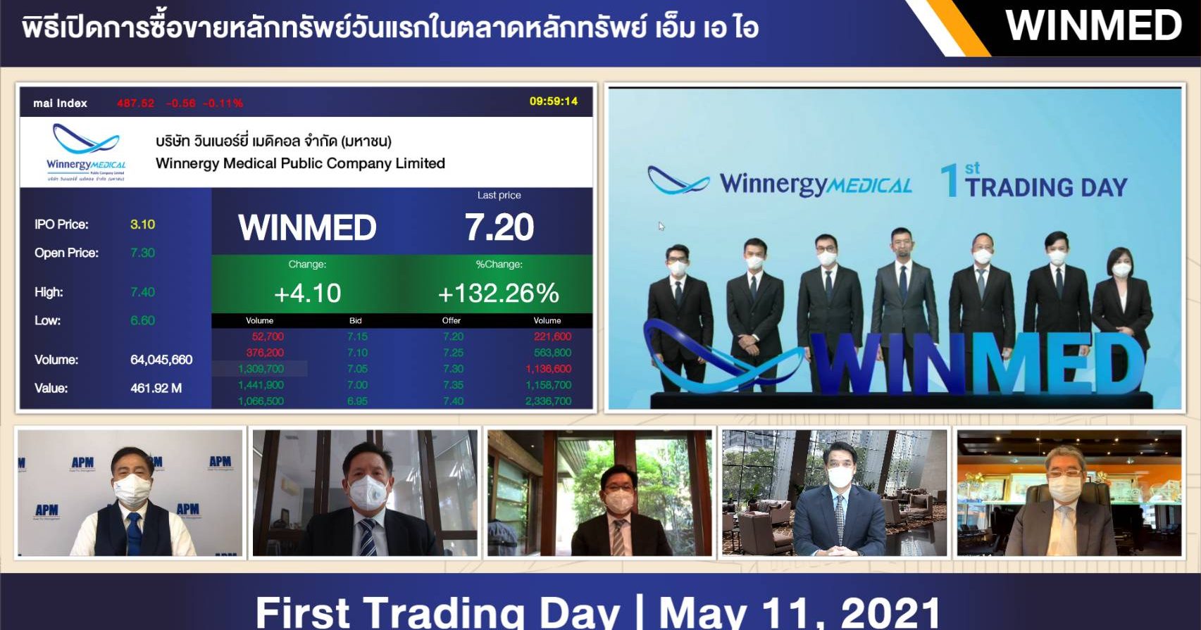 กรุงเทพฯ 11 พ.ค. – หุ้น WINMED เปิดเทรดวันแรกที่ 7.30 บาท เพิ่มขึ้น 4.20 บาท (+135.48%) จากราคาขาย IPO ที่ 3.10 บาท/หุ้น