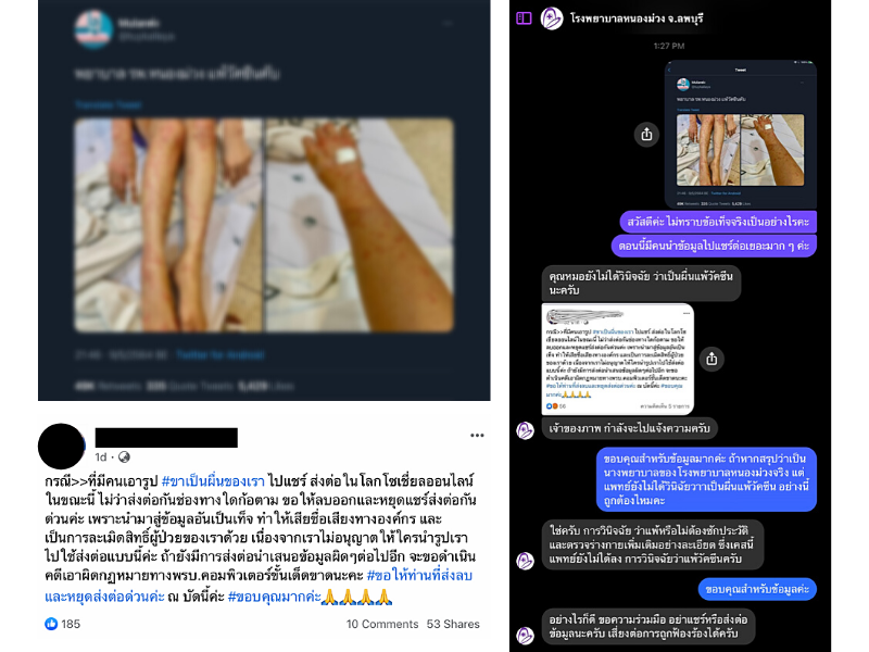 พบภาพแขนและขาที่มีผื่นสีแดงถูกเผยแพร่ร่วมกับข้อความระบุว่า “พยาบาล รพ.หนองม่วง แพ้วัคซีน” โดยเป็นการเผยแพร่บน Twitter อย่างไรก็ตามโพสต์ดังกล่าวถูกลบภายในวันเดียวกันนั้น
