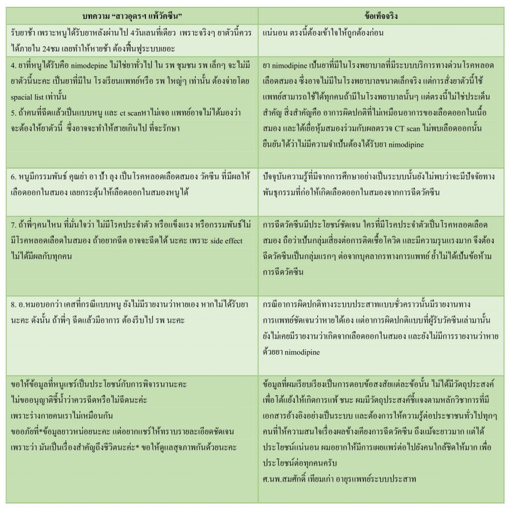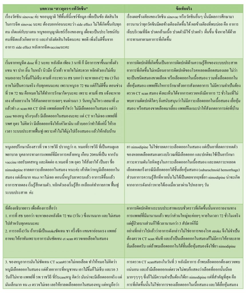 “หญิงสาวในบทความเข้ารับการฉีดวัคซีนซิโนแวค เข็มที่ 2 และมีอาการชาทั่วร่างกายมากกว่า 72 ชั่วโมงจริง แต่ขณะนี้หญิงสาวคนดังกล่าวยืนยันว่าหายเป็นปกติแล้ว ซึ่งก่อนหน้านี้ได้ทำการเอกซเรย์สมองพบว่า ระบบประสาทและสมองเป็นปกติดีทุกประการ ดังนั้นที่บอกว่ามีอาการเลือดออกในสมองเล็กน้อยนั้นไม่เป็นความจริง ส่วนการที่อ้างว่า แพทย์โรงพยาบาลอื่นให้ยา Nimodepine ทำให้รู้สึกดีขึ้น ยานี้มีสรรพคุณช่วยลดเลือดออกในสมอง ทำให้เส้นเลือดขดตัว ซึ่งหญิงสาวไม่มีอาการเลือดออกในสมอง การที่อาการดีขึ้นจึงไม่เกี่ยวข้องกับยาที่ได้รับ แต่เป็นระยะเวลาที่สามารถดีขึ้นได้เองอยู่แล้ว” พญ.พัชริดา กล่าว
